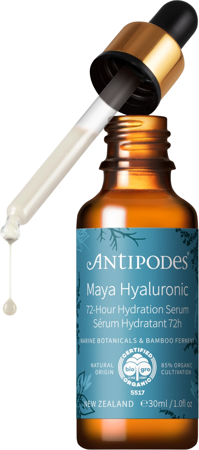 Serum Maya Hyaluronic 72-Hour Hydration znamke Antipodes je najbolj primeren za suho kožo, saj zaradi spojine iz morskih alg ohranja raven vlage do 72 ur. Rastlinska hialuronska kislina prav tako podpira učinek polnjenja in s tem zmanjšuje videz drobnih gubic. Medtem bambus, kumara in manuka med ščitijo zaščitno pregrado kože in jo oskrbujejo z vitamini in minerali. Svež, cvetlični vonj seruma obuja spomine na čudovite poletne dni.
