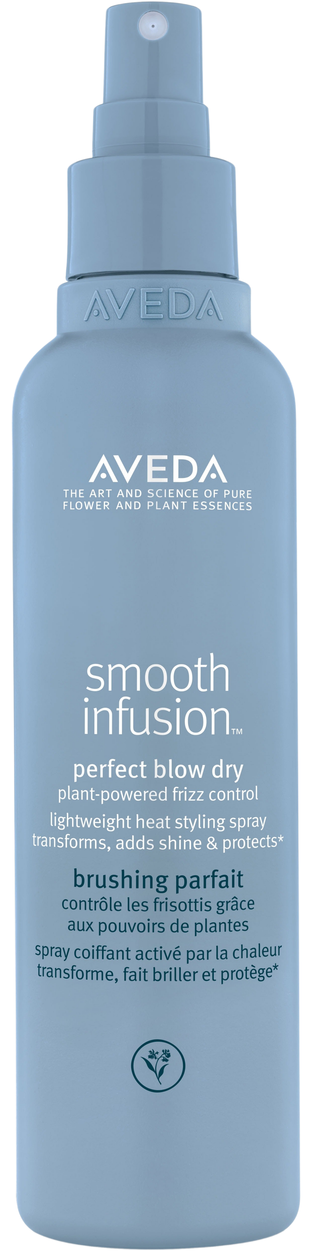 Smooth Infusion™ Perfect Blow Dry Spray znamke Aveda zagotavlja 72-urno zaščito pred frizzom, ki ovije vsak pramen in pomaga, da se vlaga vpije v lase, zgladi in zmehča lase, nagnjene k frizzu, za dolgotrajen sijaj. Veganska formula vsebuje naravni UV-filter in toplotno zaščito do 232 °C, ki ščiti vaše lase pred prekomernim izsušitvijo. Vonj bergamotke, vrtnice in sandalovine zagotavlja edinstveno dišavno izkušnjo.