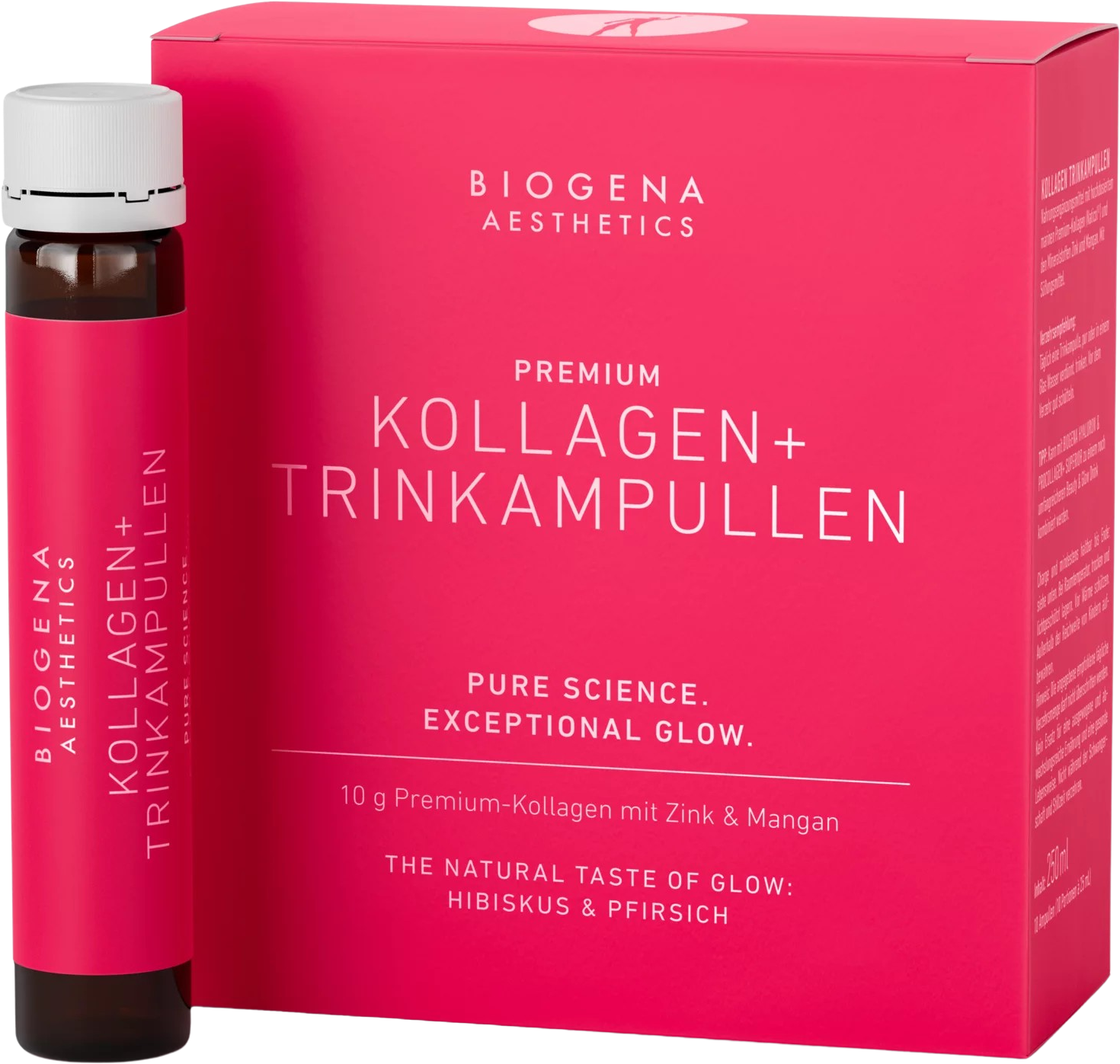 Premium kolagen+ ampule za pitje znamke BIOGENA AESTHETICS so ampule, pripravljene za uporabo, ki vsebujejo natančno odmerjeno kombinacijo hidrolizata morskega kolagena (Naticol®), cinka in mangana v sadnem okusu hibiskusa in breskve. Vsaka 25 ml ampula vsebuje približno 10 g visokokakovostnih kolagenskih proteinov iz morskih virov ter določene količine cinka in mangana, ki prispevajo k ohranjanju normalne kože in lahko ščitijo celice pred oksidativnim stresom.