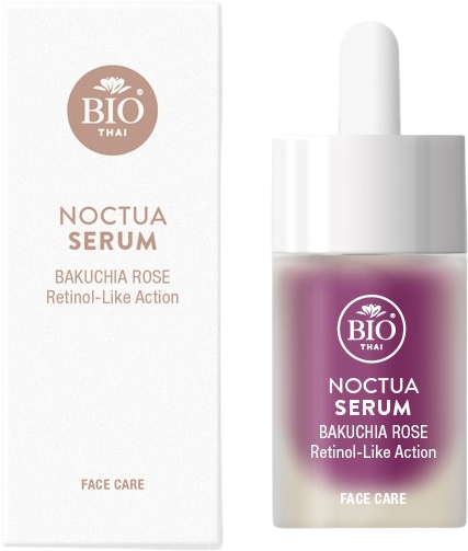 Serum Noctua znamke Bio Thai je nočna nega na rastlinski osnovi z učinkom, podobnim retinolu. Olje Bakuchiol, pridobljeno iz semen rastline bakuchi, posnema prednosti tradicionalnega retinola, ne da bi pri tem dražilo kožo. Zgladi, uravnoteži in podari sijočo polt. Svilnata tekstura seruma ovije kožo kot tanka, negovalna, a lahka tančica. Sinergija cvetnih listov damaščanske vrtnice, Centella asiatica in Pueraria mirifica podpira naravne procese regeneracije ponoči, zmanjšuje gube in zagotavlja gladko polt po prebujanju.