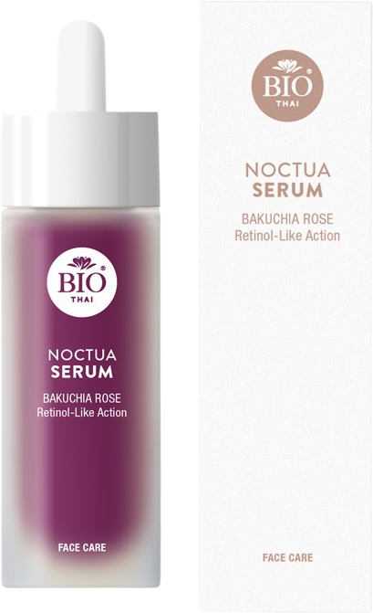 Serum Noctua znamke Bio Thai je nočna nega na rastlinski osnovi z učinkom, podobnim retinolu. Olje Bakuchiol, pridobljeno iz semen rastline bakuchi, posnema prednosti tradicionalnega retinola, ne da bi pri tem dražilo kožo. Zgladi, uravnoteži in podari sijočo polt. Svilnata tekstura seruma ovije kožo kot tanka, negovalna, a lahka tančica. Sinergija cvetnih listov damaščanske vrtnice, Centella asiatica in Pueraria mirifica podpira naravne procese regeneracije ponoči, zmanjšuje gube in zagotavlja gladko polt po prebujanju.