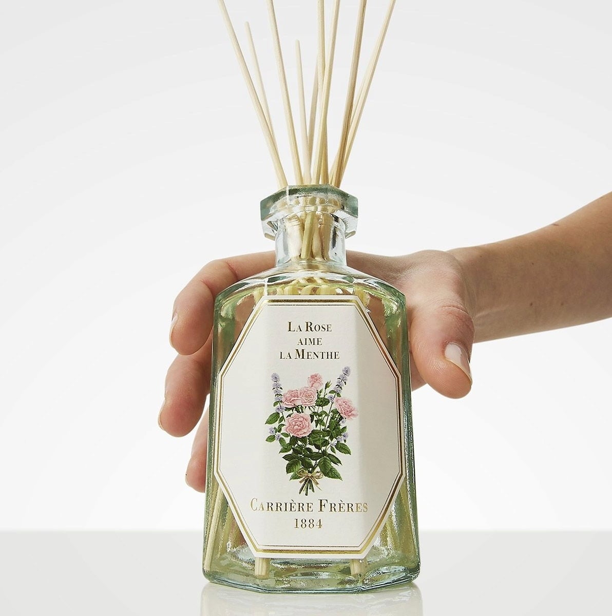 Diffuser "La Rose Aime la Menthe" znamke Carrière Frère v hladnem vremenu očara s svojim zeliščnim vonjem sveže mete. V toplem vremenu pride do izraza nežna dišava vrtnice. Vrtnica ponosno pokaže svoj izvrstni venček in razkrije prefinjenost svoje dišave. V nasprotju s tem pa meta očara s svojim poživljajočim, a subtilnim značajem. Skupaj ustvarjata harmonijo in pomirjata duha.