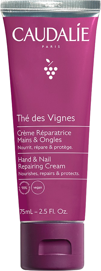 Thé des Vignes Hand & Nail Repairing Cream znamke Caudalie je popolna kombinacija intenzivne nege in neustavljivega vonja. Če so vaše roke suhe ali napete, jih ta krema v hipu obnovi - brez lepljivosti ali mastnih ostankov. Formula, obogatena z antioksidativnim oljem grozdnih pešk, negovalnim bio karitejevim maslom in zaščitnimi polifenoli krepi vašo kožo, ter naredi tudi nohte in obnohtno kožico bolj odporne.