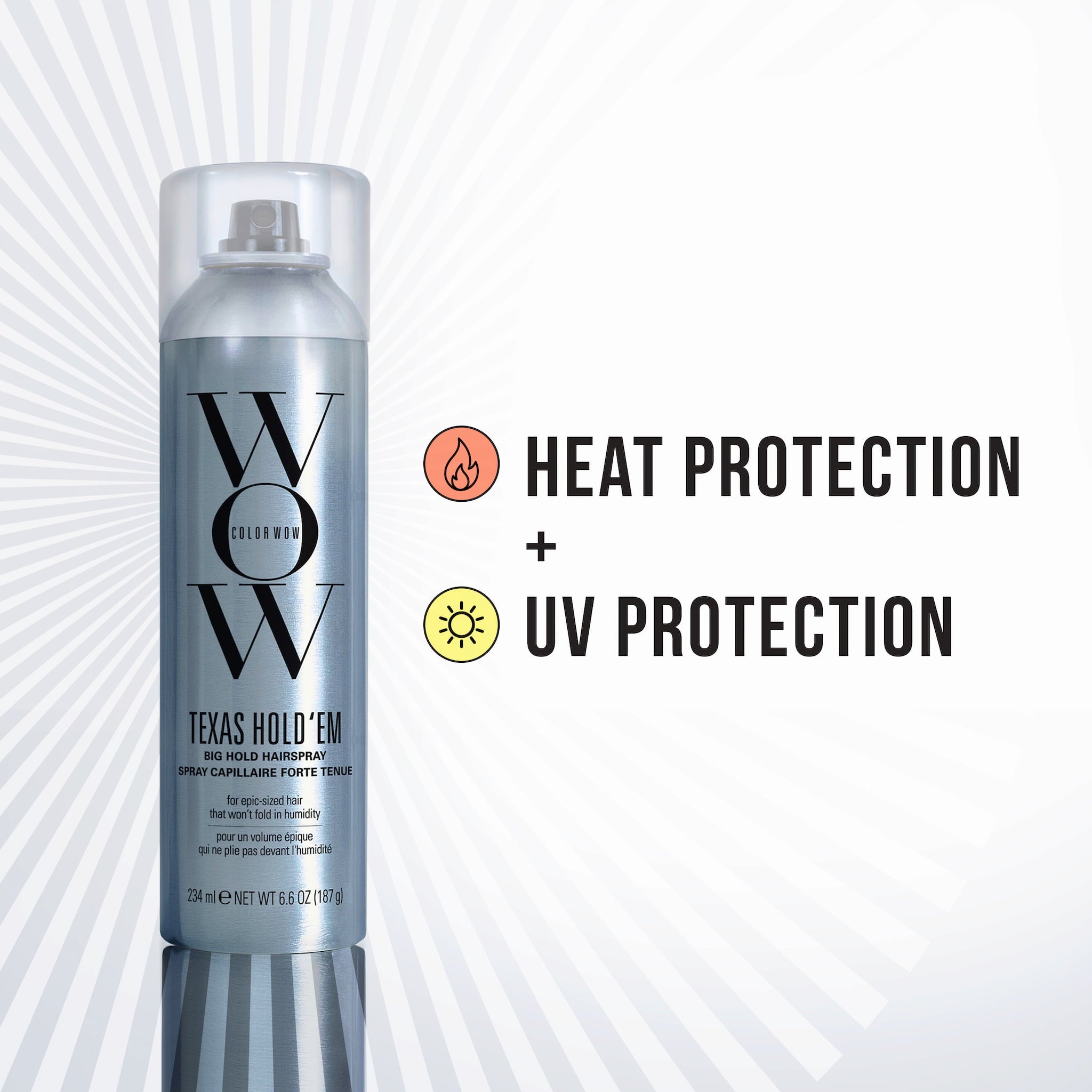 Texas Hold ‘em Big Hold Hairspray znamke Color WOW je izjemno močan lak za lase, ki ponuja dolgotrajno obstojnost, edinstven nadzor, zanesljivo zaščito pred toploto in močno odpornost proti vlagi. Fina meglica se hitro suši in ne pušča neprivlačnih ostankov v laseh. Lak zagotavlja varno obstojnost tudi pri zelo visoki vlažnosti, zato vam ni treba skrbeti za svojo pričesko niti v turobnih dneh.
