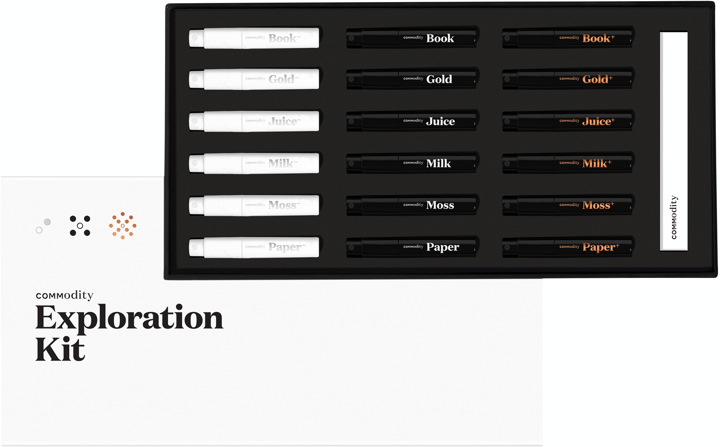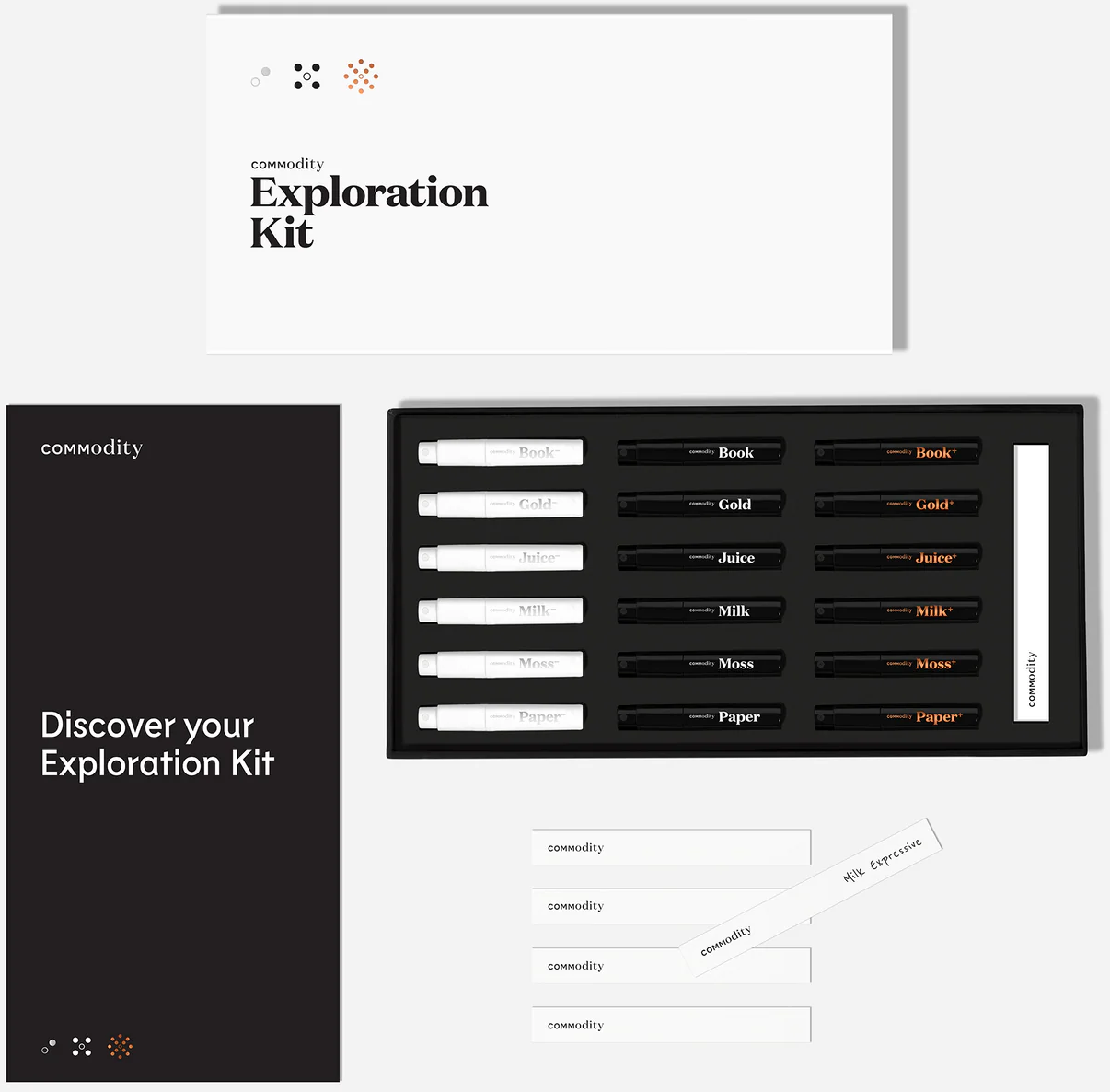 Exploration Kit 2.0 znamke Commodity je vaš osebni vodnik skozi svet dišav, ki vam pomaga odkriti vaš idealen izraz. Inovativni koncept Scent Space vam omogoča, da se odločite, kako prisoten naj bo vaš parfum: izberite med intimno, koži blizu različice Personal, drzno in edinstveno različico Expressive ali intenzivno, prostor zapolnijočo različico Bold.