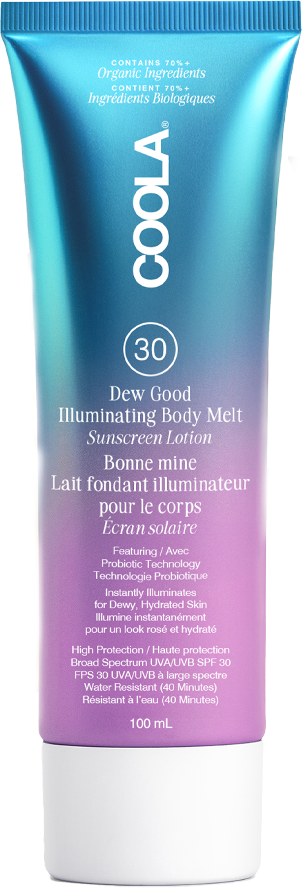 Dew Good Illuminating Body Melt SPF 30 znamke COOLA ima luksuzno formulacijo, ki ne le ščiti kožo pred sončnimi poškodbami, temveč ji tudi podari takojšen, svež in navlažen sijaj. Zahvaljujoč probiotični tehnologiji izboljšuje zadrževanje vlage in krepi naravno kožno bariero. Njegova svilnata tekstura se prijetno zlije s kožo in pusti ultralahkoten zaključek.