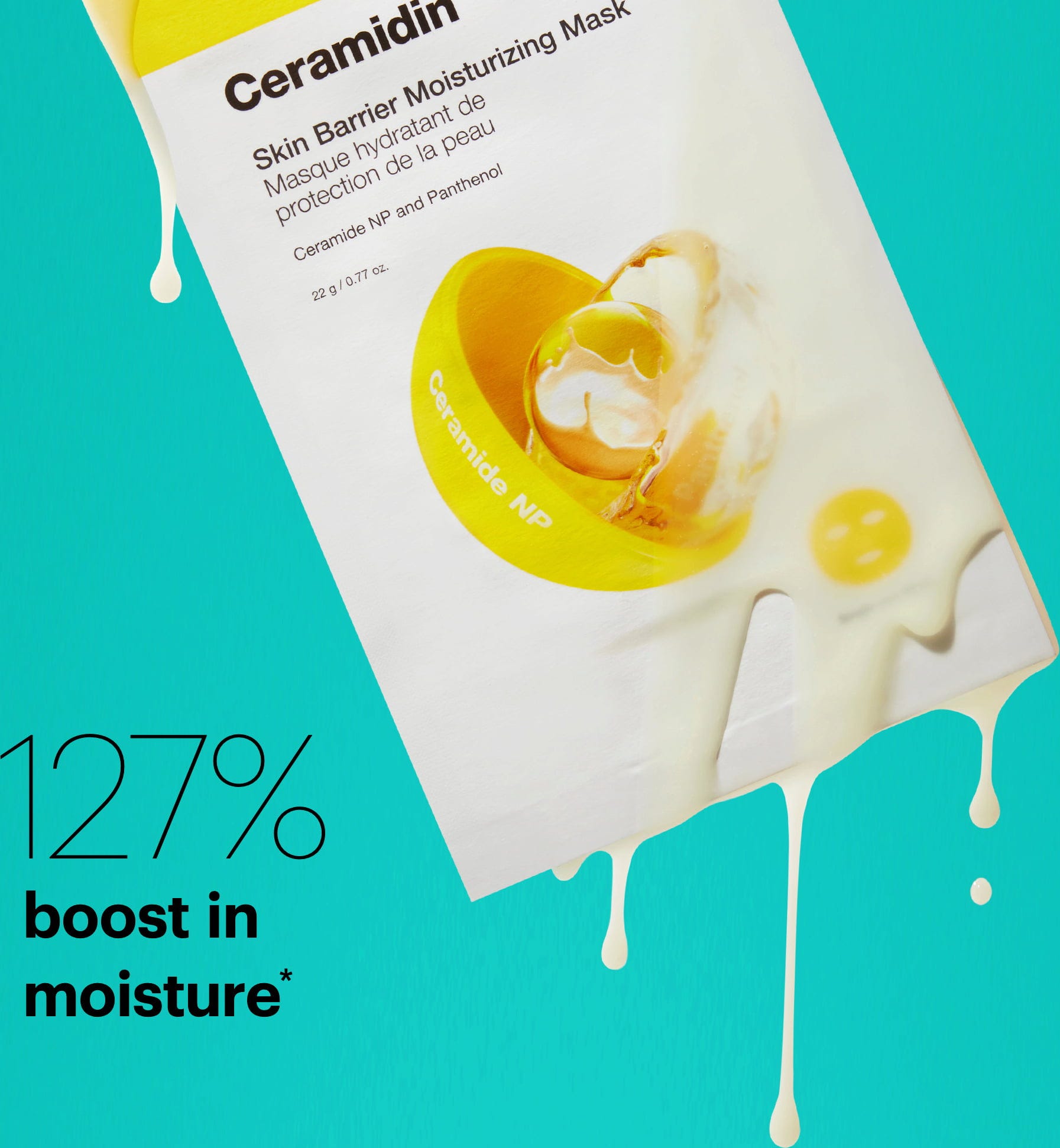 Če vaša kožna pregrada potrebuje malo več moči, je maska Ceramidin™ Skin Barrier Moisturizing Mask znamke Dr. Jart+ prava za vas. Maska je prepojena s krepilno esenco, obogateno s Ceramidom NP, pantenolom in glicerinom. Ti kožo navlažijo in zmanjšajo videz drobnih, suhih gubic.