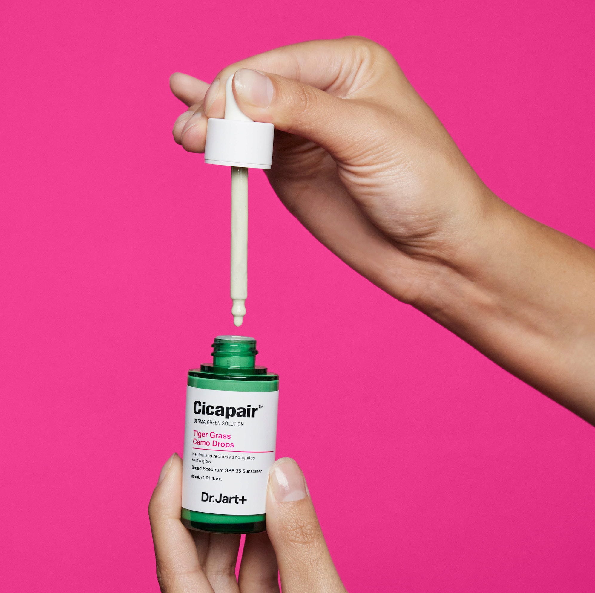 Cicapair™ Tiger Grass Camo Drops SPF 35 znamke Dr. Jart+ se individualno prilagodi vsakemu tenu kože in lahko nevtralizira in zgladi razdražene predele na obrazu. Zaradi tega je koža videti bolj enakomerna in polt začne spet sijati. Formulacija z niacinamidom ima tudi zaščitni značaj, gotu kola pa kožo pomirja in ji omogoča, da se umiri. Zahvaljujoč cinkovemu oksidu in titanovemu dioksidu, serum z zaščitnim faktorjem 35 ščiti tudi pred UVA in UVB sevanjem.
