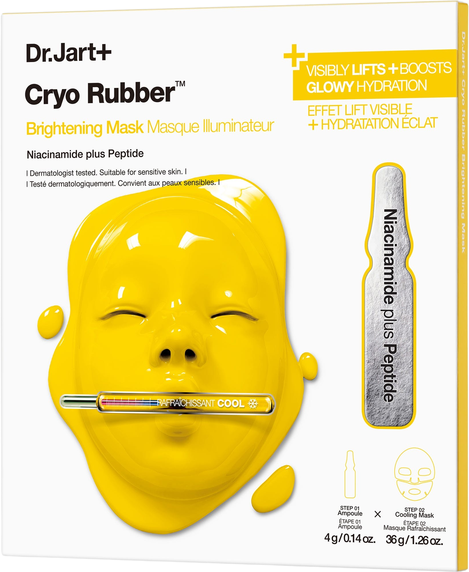 Posvetlitvena maska Cryo Rubber™ znamke Dr. Jart+ je maska za obraz, posebej zasnovana za mešano in pigmentirano kožo. Navdihnjena s korejskimi tretmaji kriolipolize, hladi, posvetli in zmanjša temne madeže za sijočo polt. Poleg maske prejmete ampulo, napolnjeno z gelu podobnim serumom, formuliranim z niacinamidom, ki ga maska strokovno zapečati. Kombinacija vlažilne maske in posvetljevalnega seruma zagotavlja intenzivno nego kože in vas nagradi z dobro navlaženo in enakomerno poltjo.
