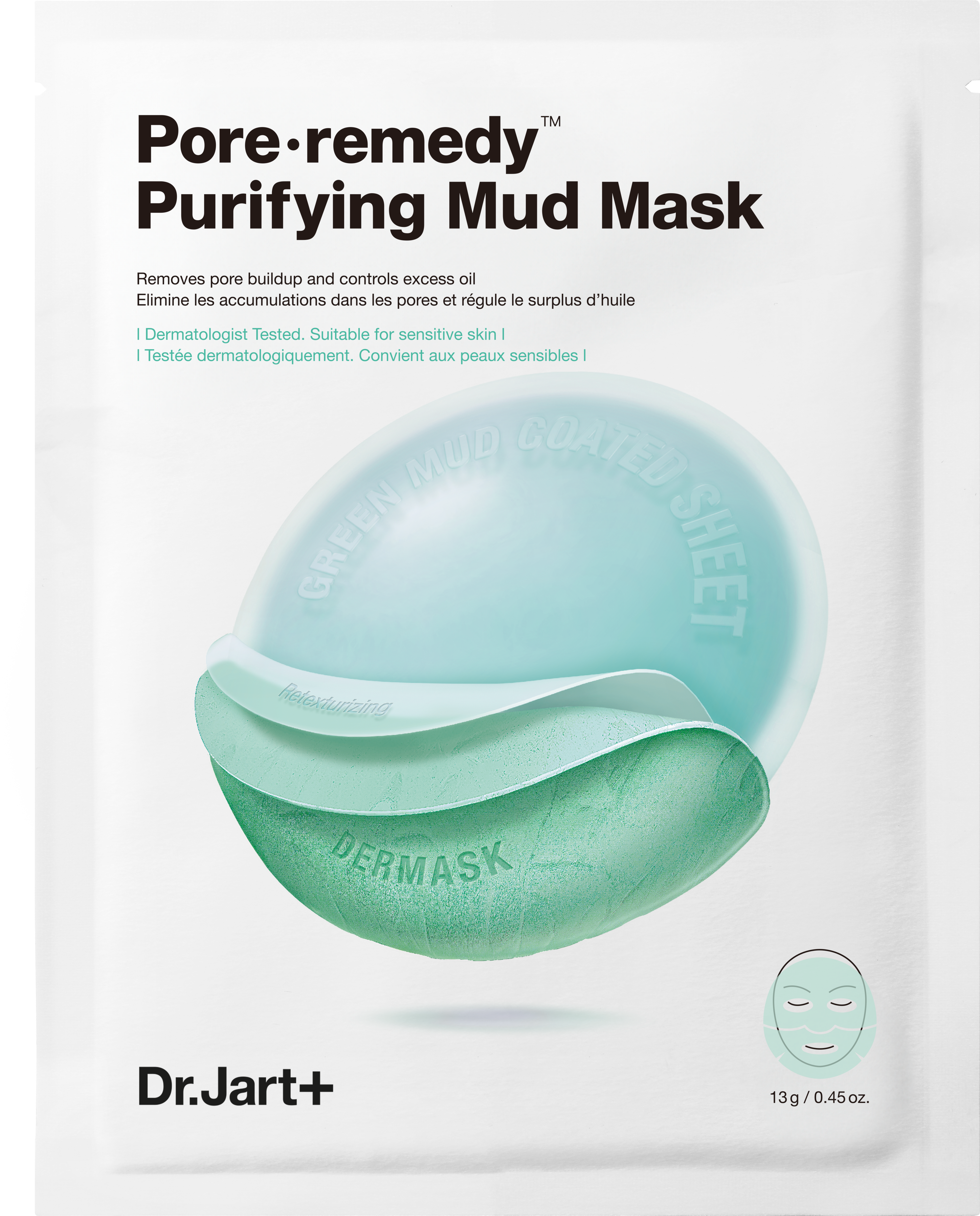 Pore.Remedy™ Purifying Mud Mask znamke Dr. Jart+ je bila razvita posebej za problematična področja in razširjene pore, kot so stranice nosu. Formula z zelenim blatom, PHA in morsko soljo odstranjuje usedline, ogrce in odvečno maščobo, obenem pa rahlja odmrle kožne celice. To ustvari bolj gladko strukturo in čistejšo polt.