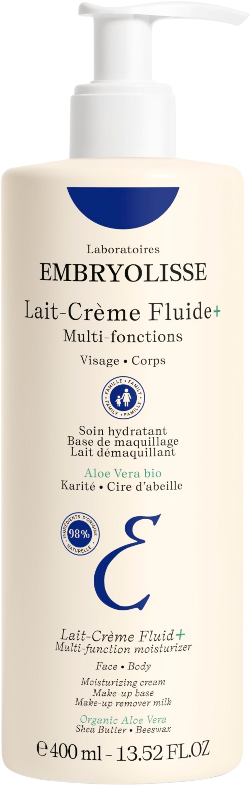 Lait-Crème Fluid+ Multi-function Moisturizer znamke Embryolisse je narejena iz 98 % naravnih sestavin in nudi intenzivno nego kože zahvaljujoč triu bio aloe vere, čebeljega voska in karitejevega masla. Krema vlaži kožo in zagotavlja optimalno zaščito pred okoljskimi stresi. Z mlečno, lahko teksturo vlažilna krema ustreza potrebam kože celotne družine in se lahko uporablja na obrazu in telesu.