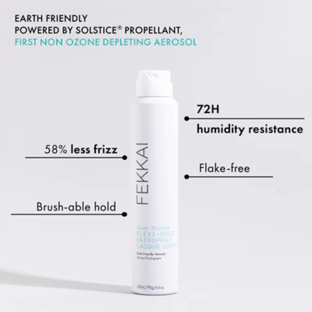 Lak za lase Clean Stylers Flexi-Hold znamke FEKKAI poskrbi za popolno oblikovanje in zaradi izjemno finega pršila ne pušča grdih sledi v laseh. Formula, ki ščiti tudi pred toplotnimi poškodbami, zagotavlja lasem dovolj vlage in tako nudi visoko stopnjo elastičnosti, da v trenutku spremenite svojo pričesko in jih tudi po pršenju zlahka razčešete. Riževe beljakovine, vitamin E in glicerin prav tako pomagajo preprečevati nakodranost in lomljenje, hkrati pa lasem dajejo sijoč sijaj. Sprej, ki ga poganja Solstice® Propellant, ki ne uničuje ozona, ponuja tudi okolju prijazno alternativo.