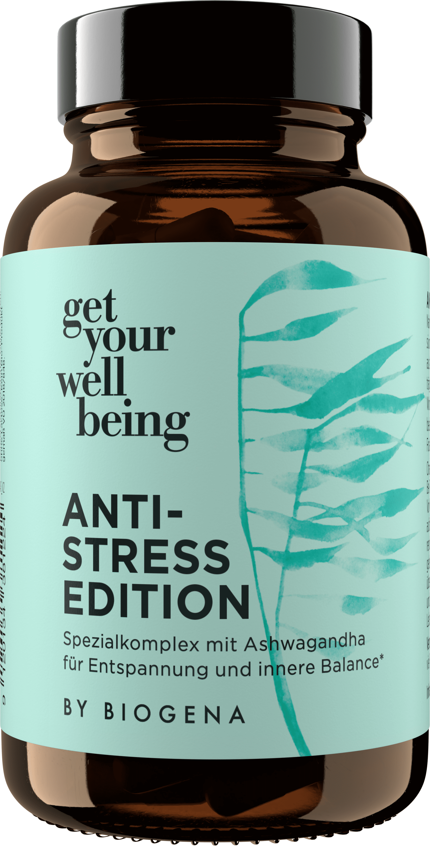Anti Stress Edition znamke get your wellbeing by BIOGENA ponuja ciljno usmerjeno kombinacijo magnezija, vitaminov skupine B (aktivirani B6, B12 v trojni mešanici in aktivirani folat) ter visok odmerek izvlečka ašvagande. Ta skrbno uravnotežena formula podpira tako duševno kot telesno počutje v obdobjih povečanega stresa in s tem spodbuja notranje ravnovesje.