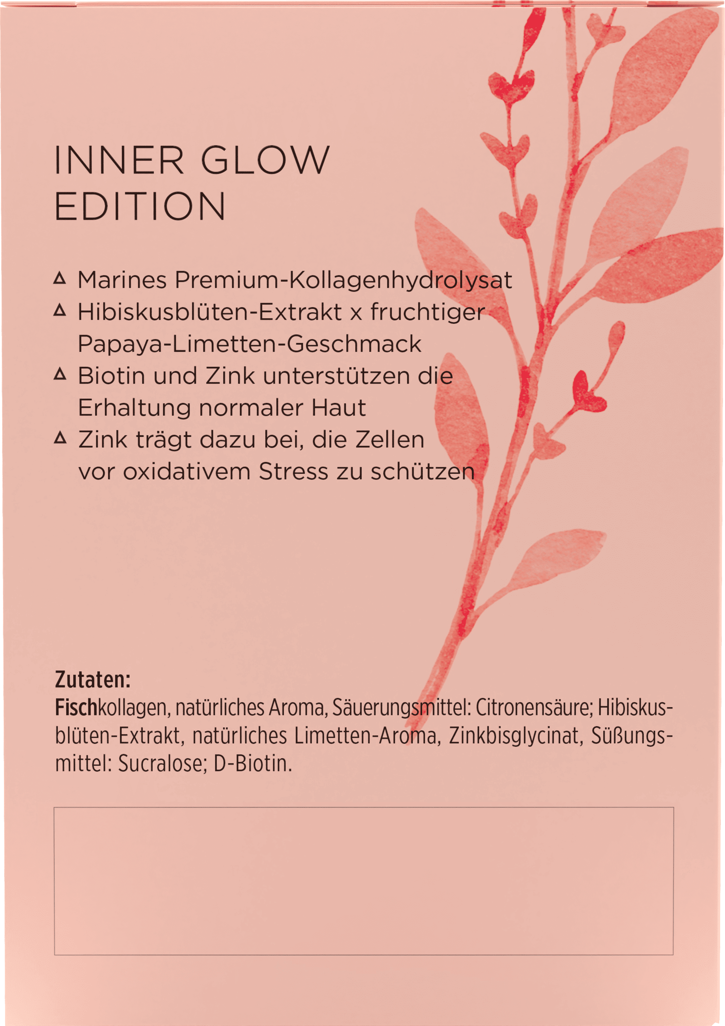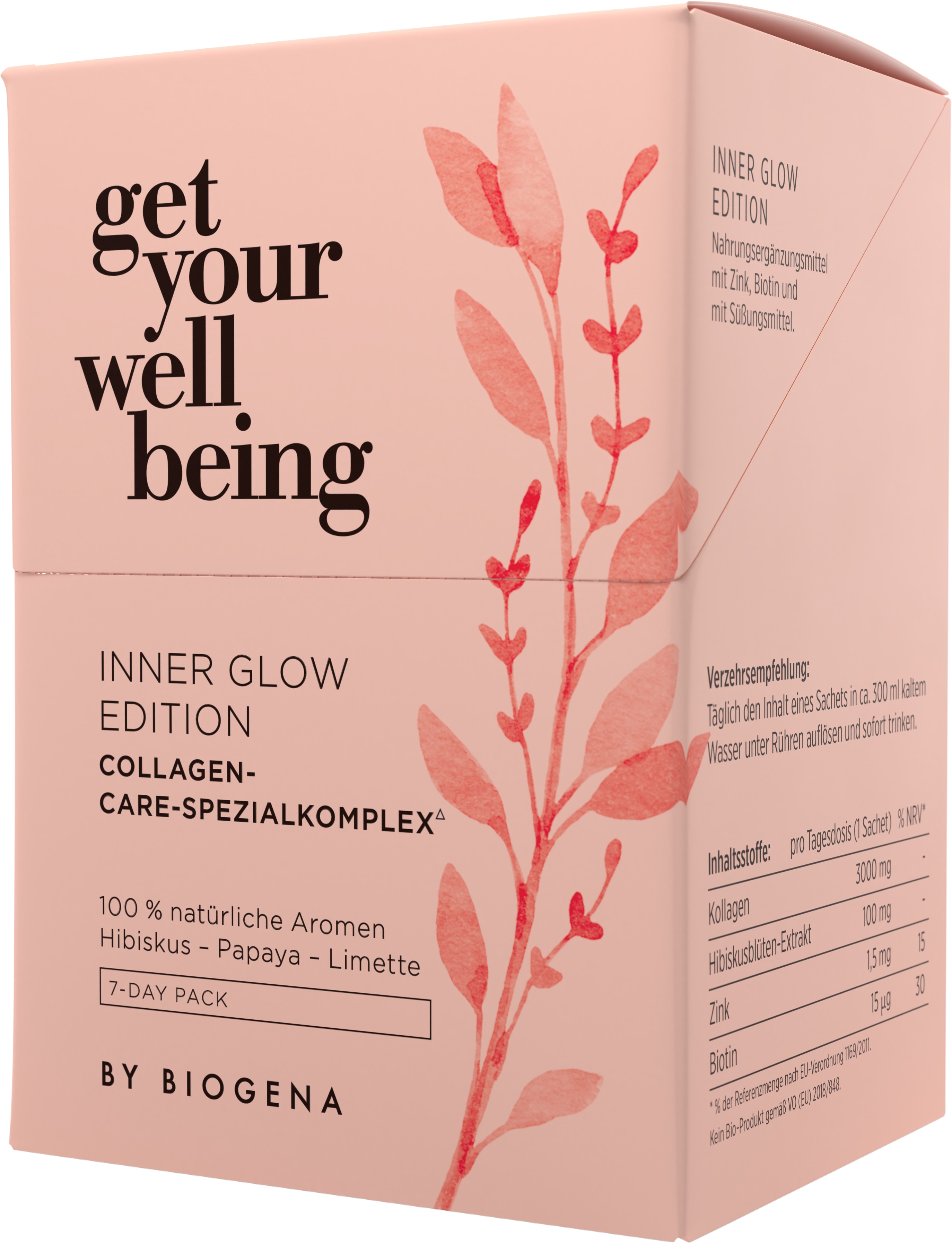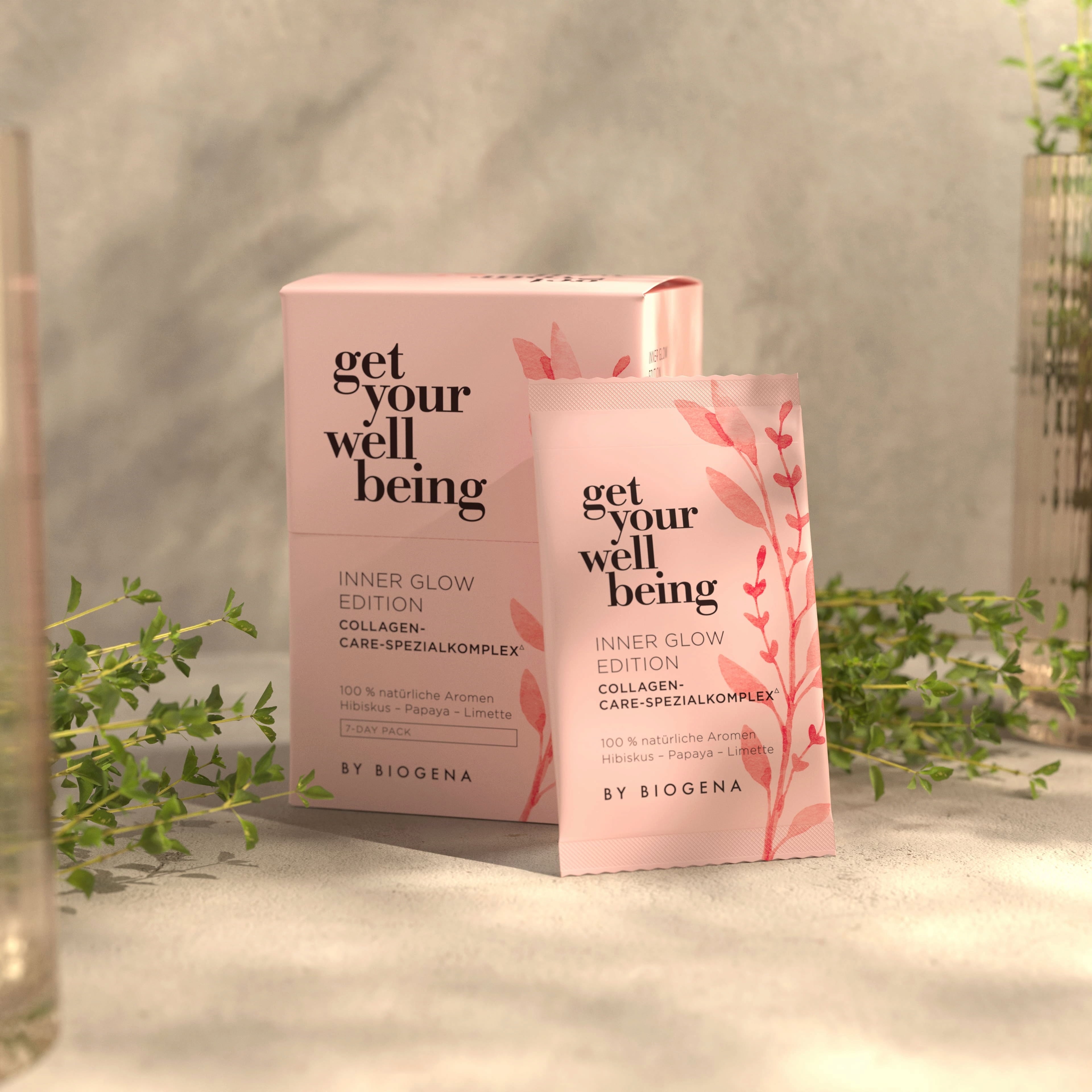 Inner Glow Edition znamke get your wellbeing by BIOGENA vsebuje visokokakovosten kolagen v prahu, kombiniran z biotinom, cinkom in izvlečkom cvetov hibiskusa. Biotin in cink spodbujata ohranjanje normalne kože, las in nohtov. Vrečke z mikro napitki ponujajo naraven okus hibiskusa, papaje in limete ter zagotavljajo hidroliziran vrhunski kolagen morskega izvora. Ekskluzivni kolagen NATICOL® je sestavljen predvsem iz peptidov ribjega kolagena tipa I in se ponaša z odlično biološko uporabnostjo. Hkrati kot stranski produkt trajnostnega ribogojstva prispeva k ohranjanju morskih virov.