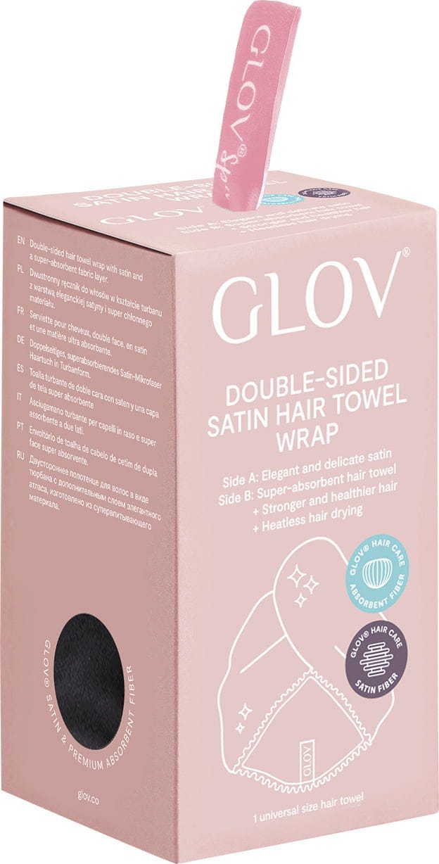 Dvostranski turban se lahko nosi na obeh straneh. Super vpojna mikrovlakna GLOV® na eni strani absorbirajo vlago po šamponiranju, satenasta stran pa ni le videti odlično, ampak preprečuje lomljenje las, učinek statične elektrike in zapletanje las. Hair Wrap je idealen izdelek za skodrane lase ali za vse tiste, ki greste včasih ven z mokrimi lasmi ali pa Hair Wrap nosite kot modni dodatek.