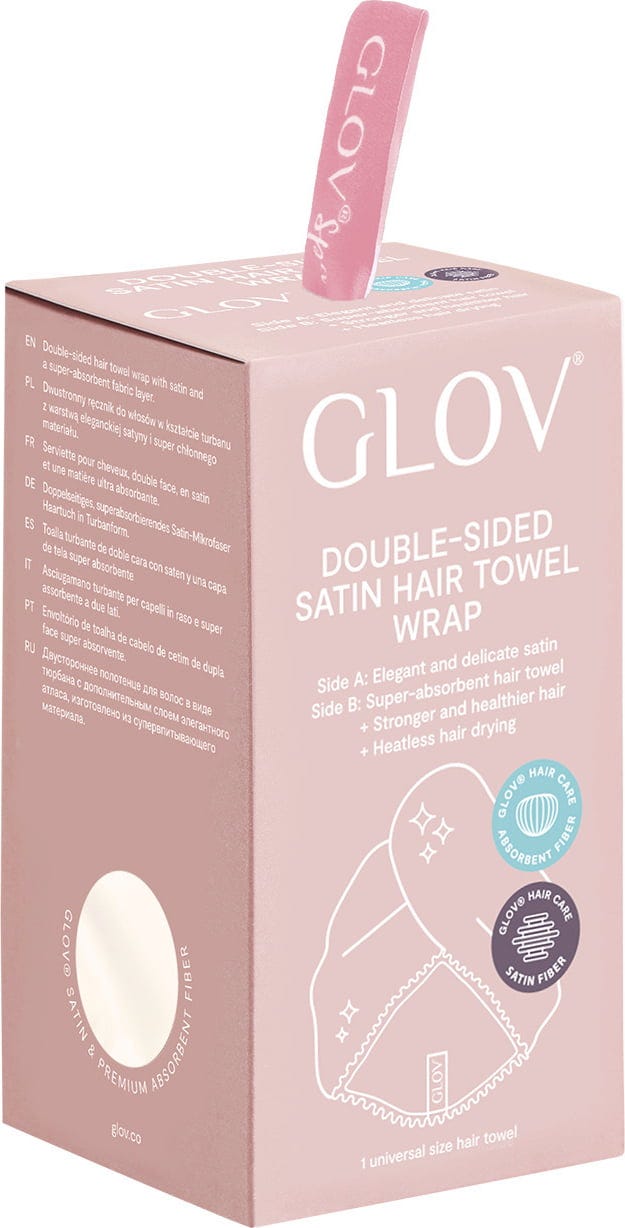 Dvostranski turban se lahko nosi na obeh straneh. Super vpojna mikrovlakna GLOV® na eni strani absorbirajo vlago po šamponiranju, satenasta stran pa ni le videti odlično, ampak preprečuje lomljenje las, učinek statične elektrike in zapletanje las. Hair Wrap je idealen izdelek za skodrane lase ali za vse tiste, ki greste včasih ven z mokrimi lasmi ali pa Hair Wrap nosite kot modni dodatek.