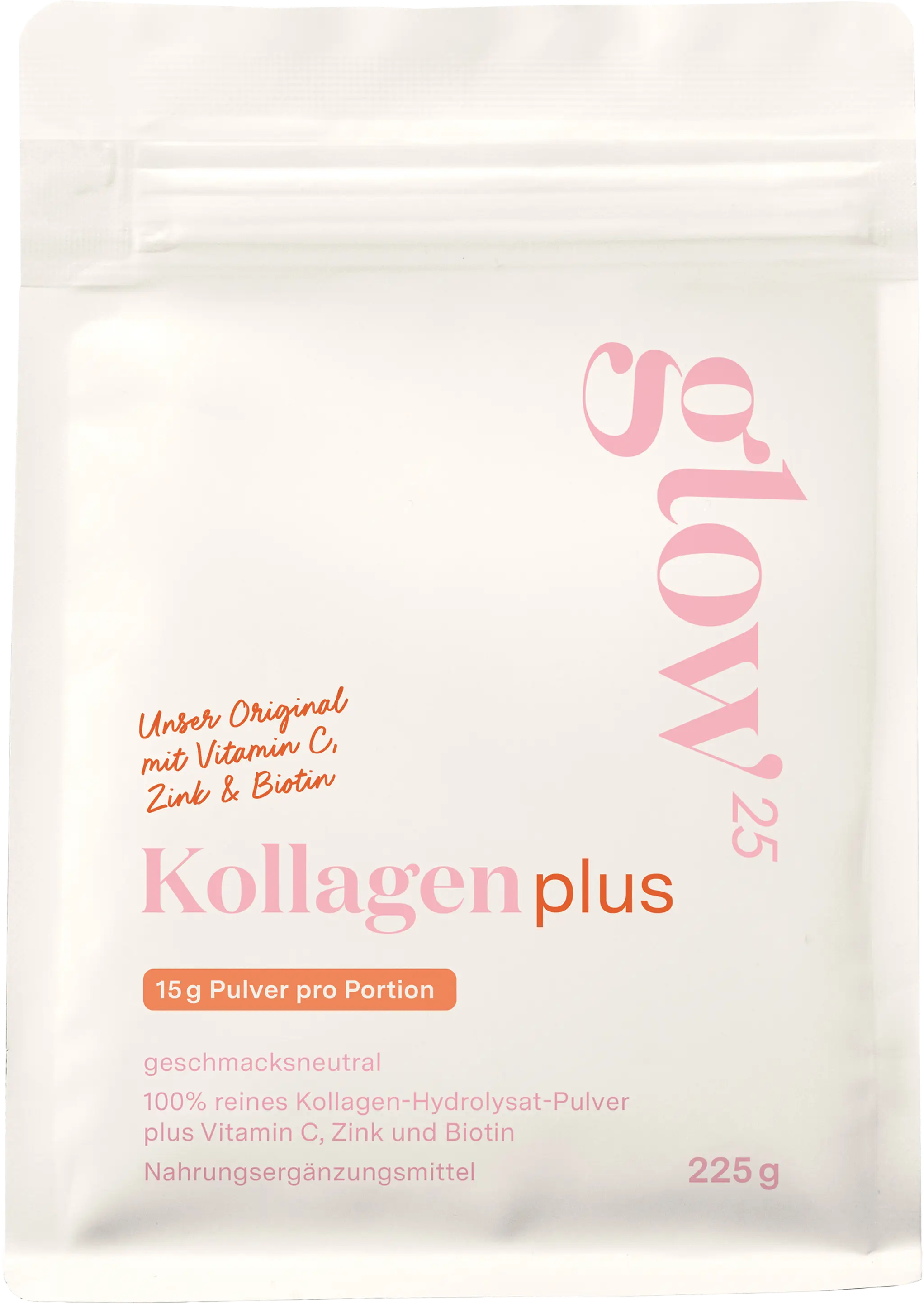 Collagen Plus znamke Glow25 združuje visokokakovosten kolagen hidrolizat z vitaminom C, cinkom in biotinom. Prašek brez okusa se lahko enostavno vmeša v hladne in tople napitke ali hrano – idealno za vsakodnevno uporabo.