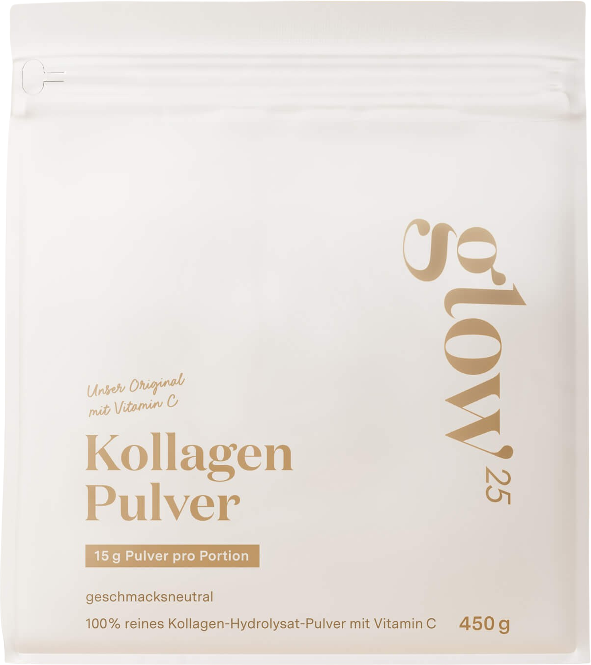 Kolagen v prahu Glow25 ponuja kombinacijo finih kolagenskih peptidov in vitamina C. Vsebovan vitamin C prispeva k normalni tvorbi kolagena za normalno delovanje kože, kosti in hrustanca. Vitamin C podpira tudi zaščito celic pred oksidativnim stresom.