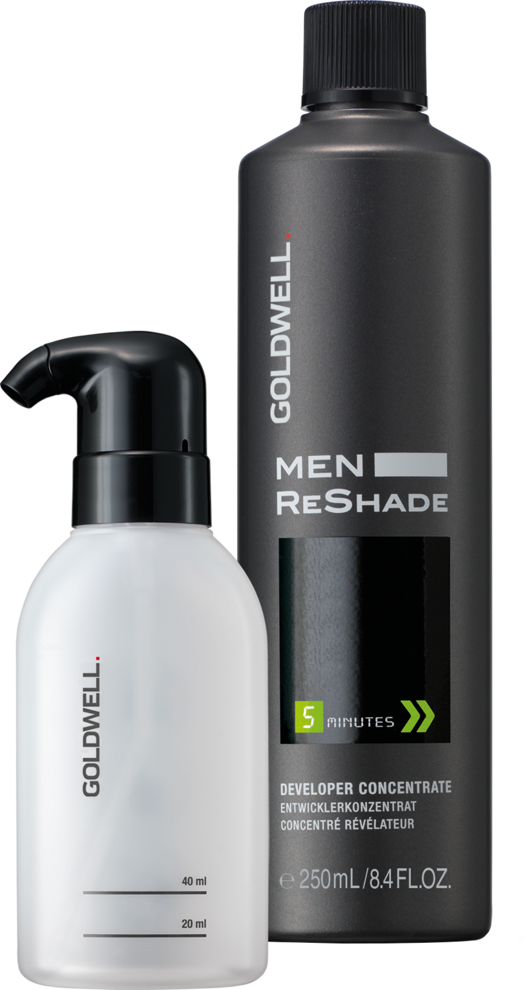 Men ReShade Hair Set znamke GOLDWELL je sestavljen iz koncentrata razvijalca ReShade in posebne stekleničke z aplikatorjem. Dopolnjuje se z izdelki Men ReShade Powershots znamke GOLDWELL, ki zagotavljajo popolno prekrivanje sivih las.