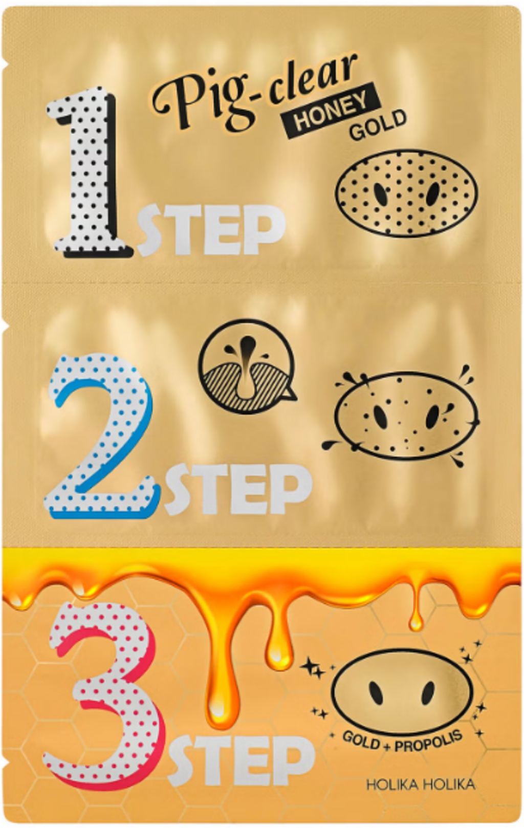 Znebite se ogrcev v hipu s kompletom Pig Nose Clear Blackhead 3-Step Kit - Honey Gold Edition znamke Holika Holika.