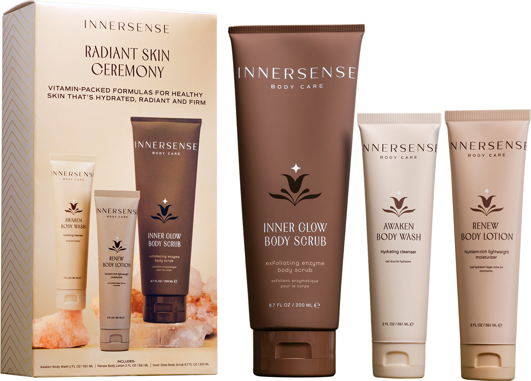 Komplet za nego telesa Radiant Skin Ceremony znamke Innersense ponuja negovalno in tristopenjsko rutino nege telesa. Vse formule so obogatene z Vitarevive Trio, kombinacijo vitaminov B5, C in D, ki spodbuja hidratacijo, sijaj in elastičnost.