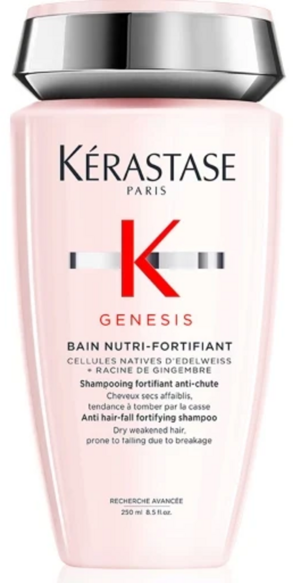 Šampon Genesis Bain Nutri-Fortifiant znamke Kérastase temeljito očisti grobe, suhe lase in jih ščiti pred lomljenjem in izpadanjem. Lase in lasišče osvobaja ostankov, medtem ko poživljajoči ingver neguje lasišče. Planika zagotavlja vlago in moč, zmanjšuje lomljenje in izpadanje las ter olajša česanje.