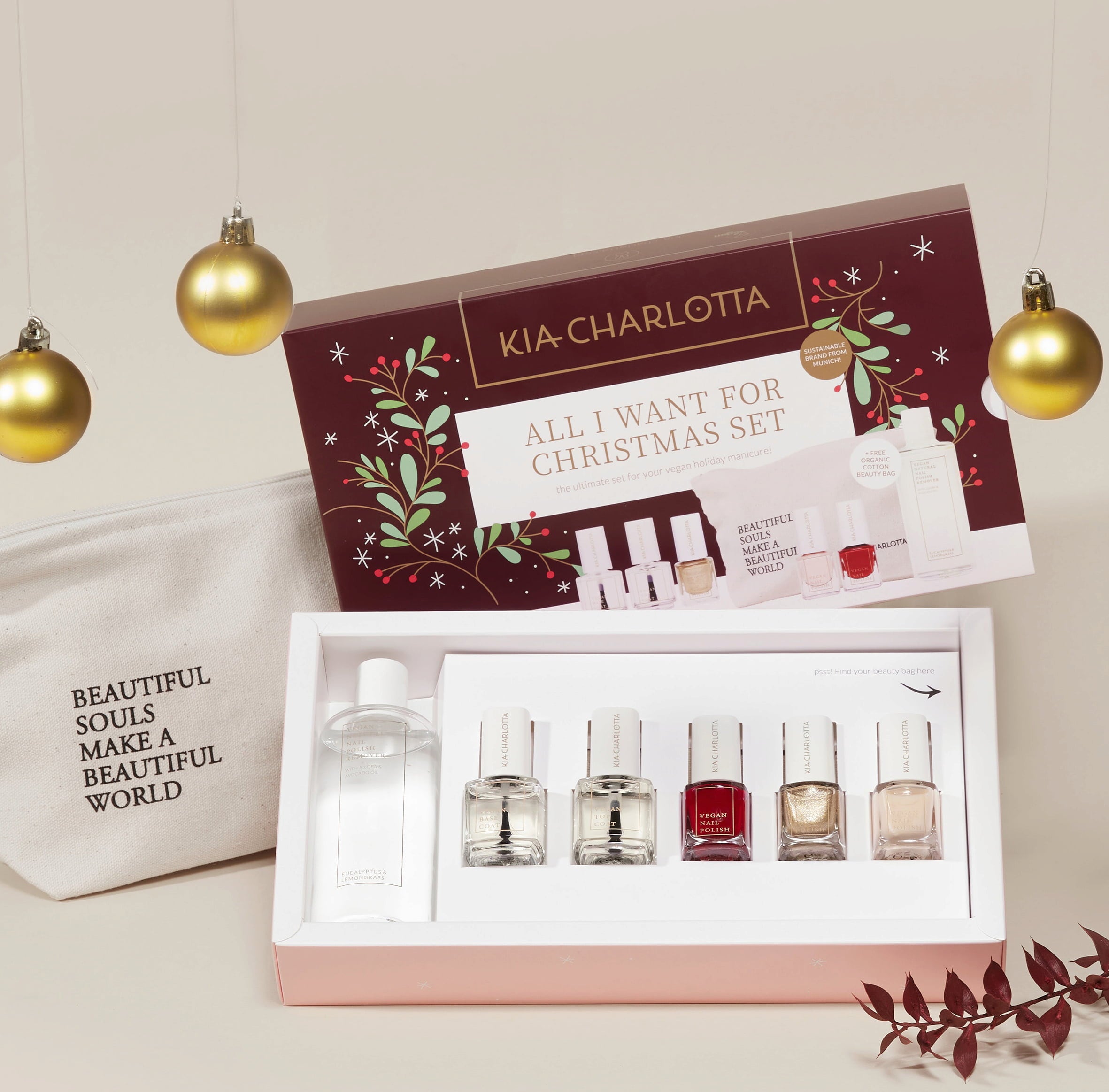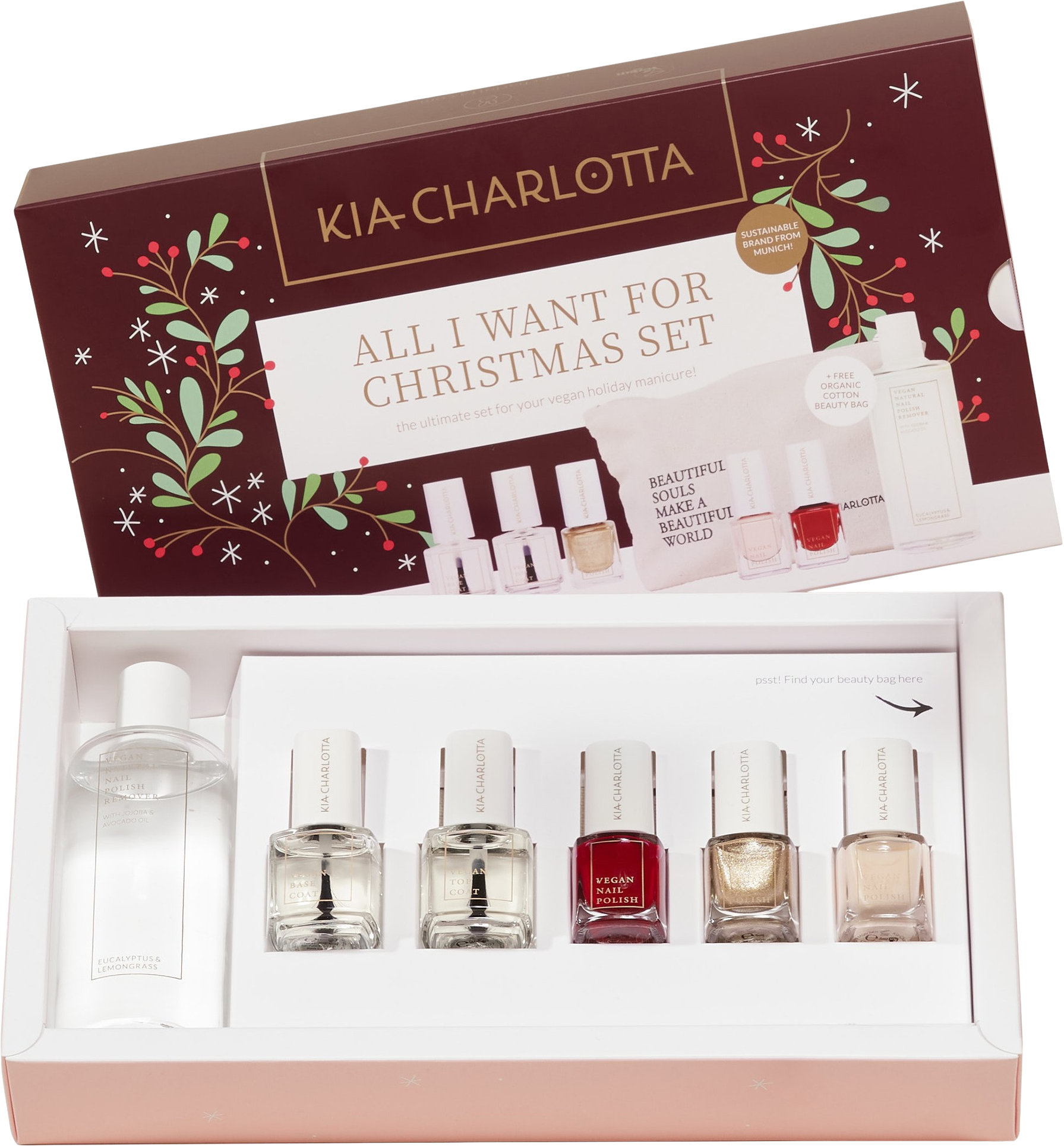 Komplet All I Want for Christmas znamke Kia-Charlotta ponuja vse, kar potrebujete za praznično manikuro: podlak in nadlak, tri barve lakov za nohte in negovalni odstranjevalec laka za nohte. Ti fantastični nepogrešljivi kosi so pakirani v elegantni darilni škatli, ki vključuje tudi ljubko kozmetično torbico. Presenetite svoje najdražje ali pa si privoščite nekaj čarobnih trenutkov v tem božičnem času.