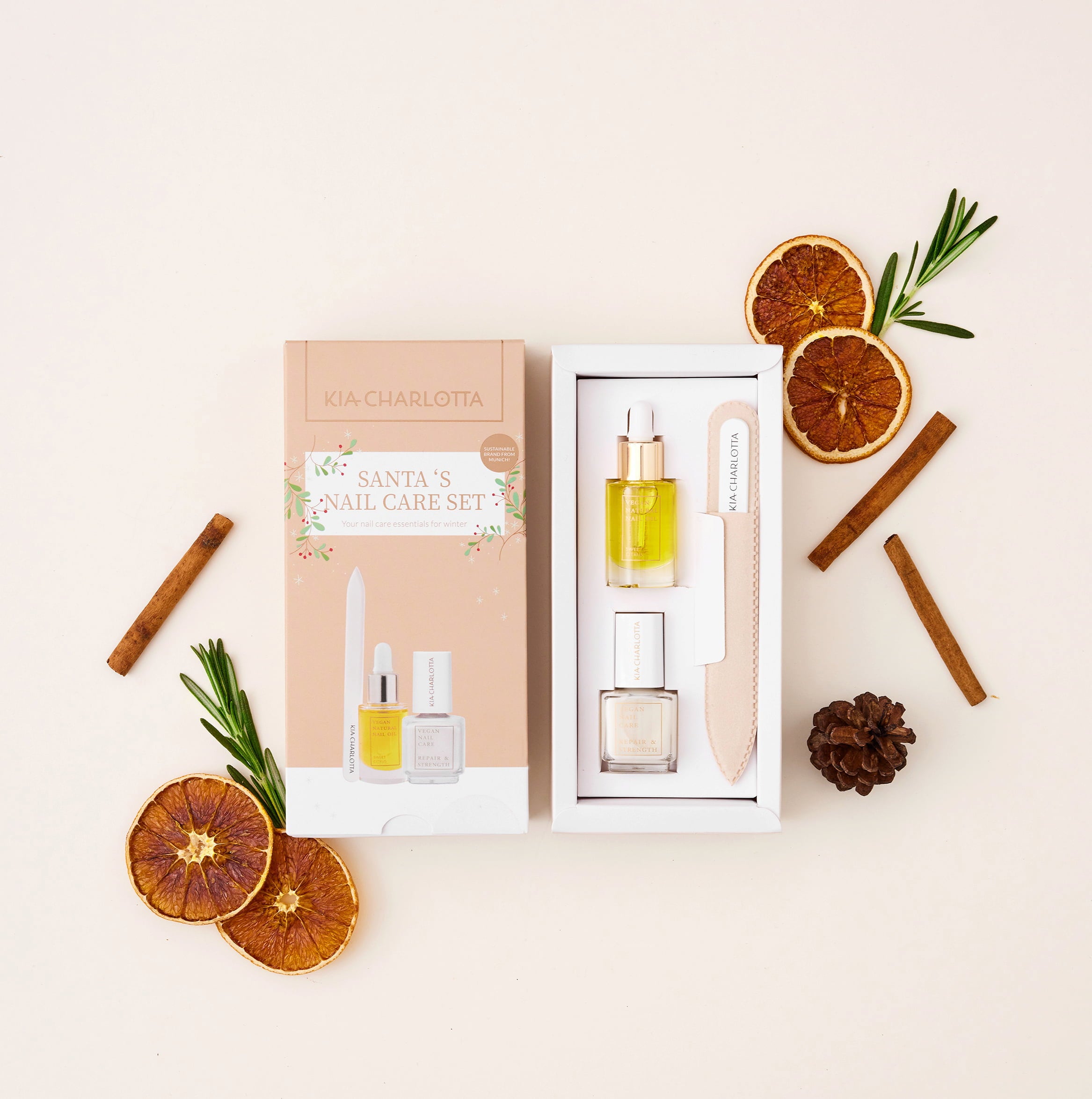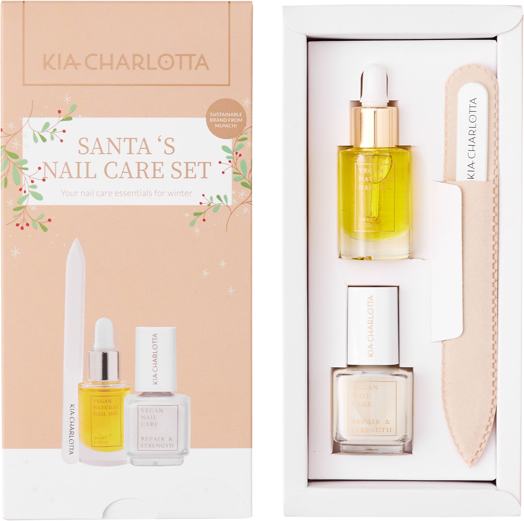 Santa’s Nail Care X-Mas Set znamke Kia-Charlotta ponuja vse, kar potrebujete za negovane in glamurozne nohte. Kombinacija negovalnega utrjevalca za nohte, negovalnega olja za nohte in visokokakovostne pilice za nohte zagotavlja popolno manikuro. Ta set, pakiran v čudovito oblikovani škatli, je idealno darilo za vaše najdražje ali majhno darilce zase.