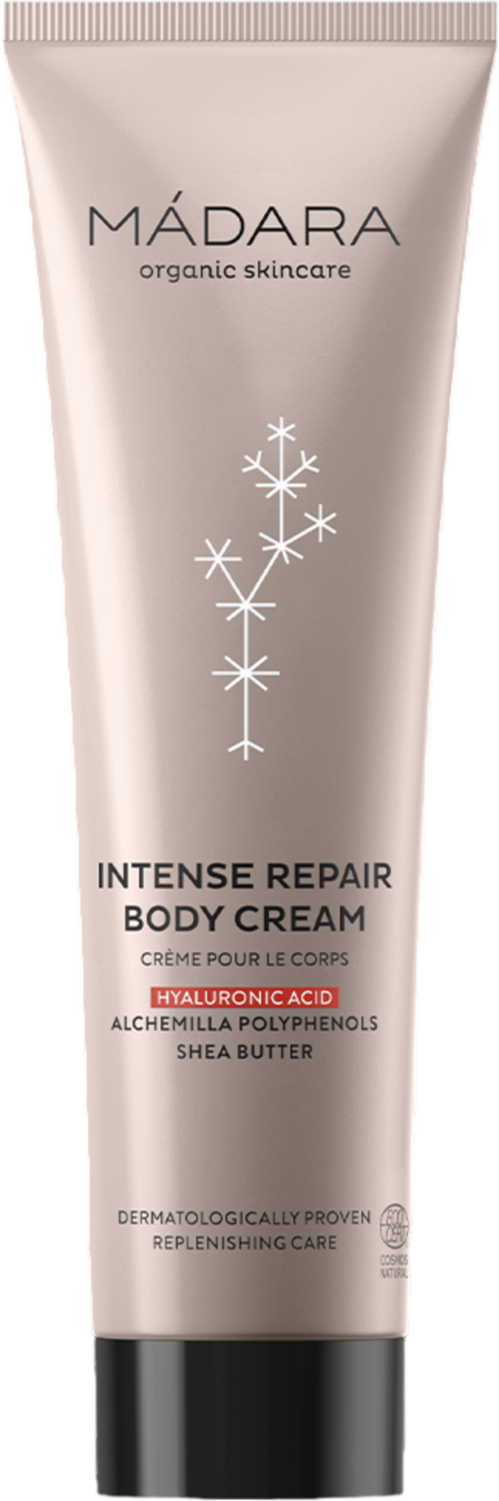 Intense Repair Body Cream znamke MÀDARA z dragoceno kombinacijo hialuronske kisline, kakavovega masla in antioksidantov zagotavlja gladko in nahranjeno kožo. Njena žametna tekstura je še posebej enostavna za nanos in se hitro vpije, zaradi česar je koža mehka in gladka, vse brez sintetičnih dišav ali barvil.