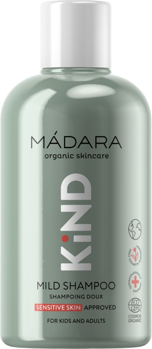 KIND Mild Shampoo znamke MÁDARA nežno in temeljito očisti lase, ne da bi pri tem dražil lasišče. Hranljivi izvlečki lipovih cvetov in lanenega semena zagotavljajo intenzivno vlago in lažje razčesavanje las. Formulacija ne vsebuje sintetičnih dišav in barvil, zato je primerna tudi za dojenčke od prvih dni življenja naprej.