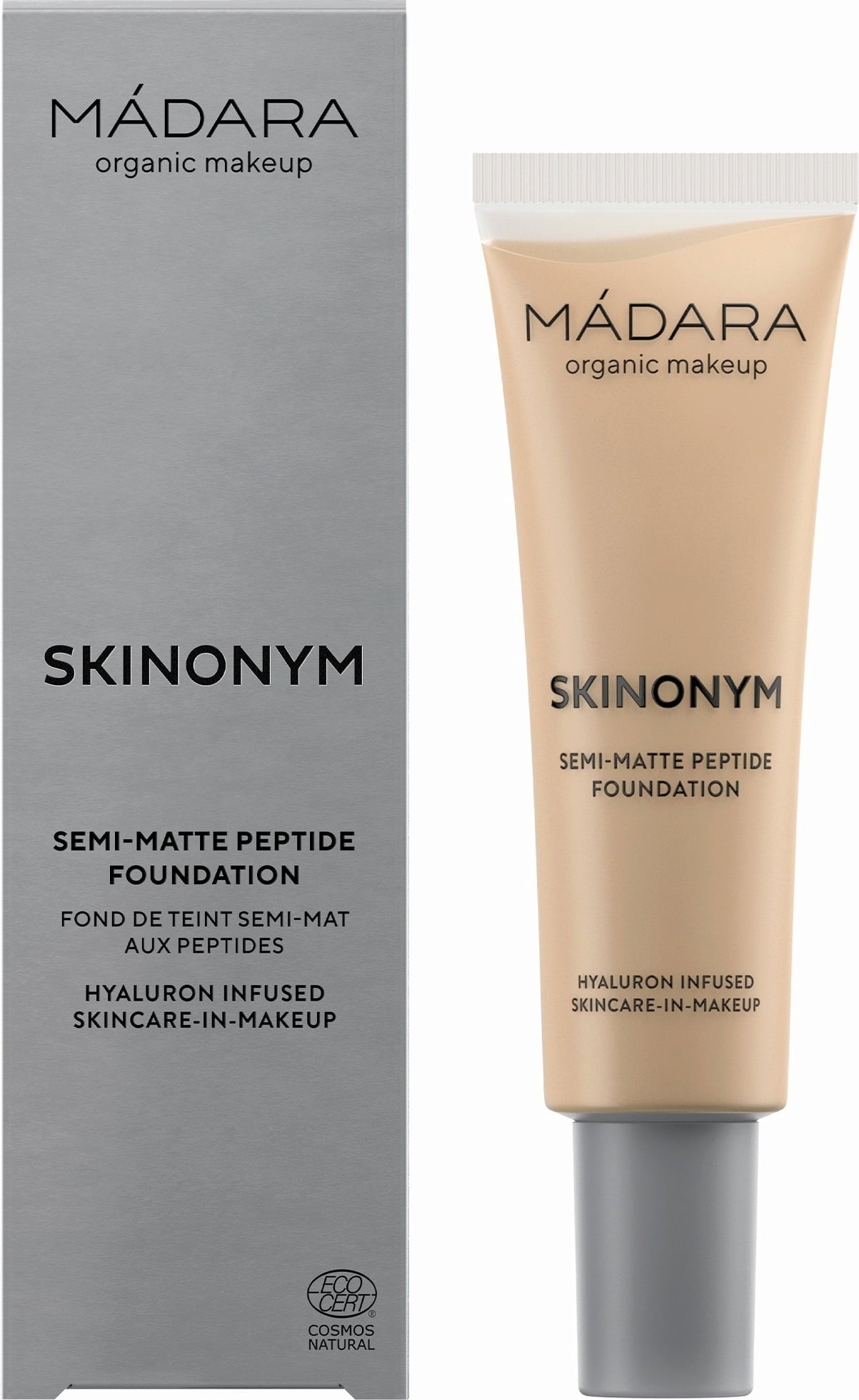 SKINONYM Semi-Matte Peptide Foundation znamke MÀDARA so razvili strokovnjaki za nego kože. Ta tekoča podlaga je popolna za zagotavljanje brezhibne, naravne in polmat prekrivnosti. Edinstvena, lahka tekstura se prilagaja vsem tipom kože in zagotavlja enakomeren zaključek ter svež videz. Primerna je za vse tipe kože, najbolj pa za mastno kožo. Formula vsebuje močne negovalne sestavine, kot so rastlinski peptidi, hialuronska kislina ter izvlečki borovnic in potonike, ki delujejo sinergistično, da vlažijo, zapolnijo in zaščitijo kožo, hkrati pa spodbujajo proizvodnjo lastnega kolagena v koži.