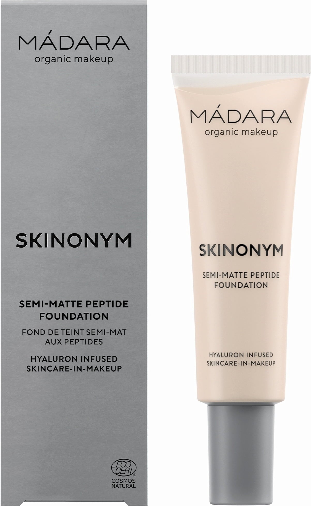 SKINONYM Semi-Matte Peptide Foundation znamke MÀDARA so razvili strokovnjaki za nego kože. Ta tekoča podlaga je popolna za zagotavljanje brezhibne, naravne in polmat prekrivnosti. Edinstvena, lahka tekstura se prilagaja vsem tipom kože in zagotavlja enakomeren zaključek ter svež videz. Primerna je za vse tipe kože, najbolj pa za mastno kožo. Formula vsebuje močne negovalne sestavine, kot so rastlinski peptidi, hialuronska kislina ter izvlečki borovnic in potonike, ki delujejo sinergistično, da vlažijo, zapolnijo in zaščitijo kožo, hkrati pa spodbujajo proizvodnjo lastnega kolagena v koži.