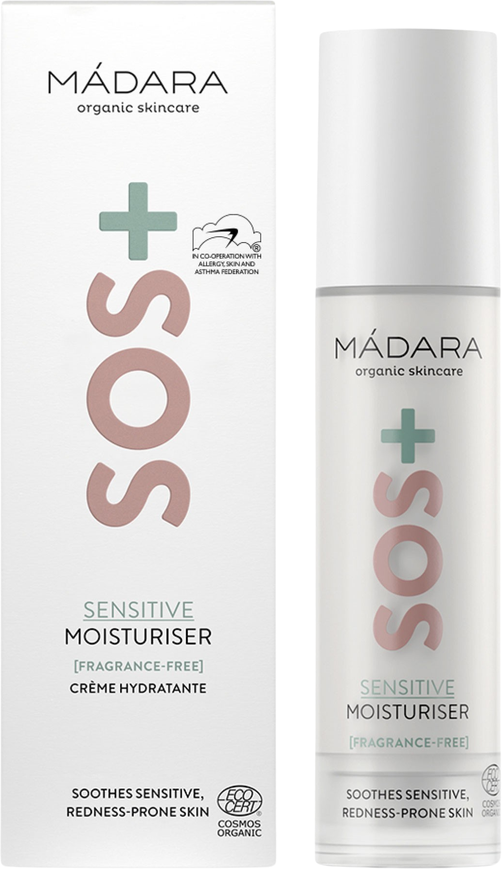 SOS+ Sensitive Moisturizer znamke MÀDARA je lahka, neodišavljena krema za obraz, ki zagotavlja optimalno dnevno nego za razdraženo, občutljivo in obremenjeno kožo. Zagotavlja vlago in z izvlečki rdečih alg in hialuronsko kislino zagotavlja prijeten občutek na koži. Izvlečki alg v obliki biotehnološko pridobljenih molekul nudijo uravnalne in zaščitne lastnosti.