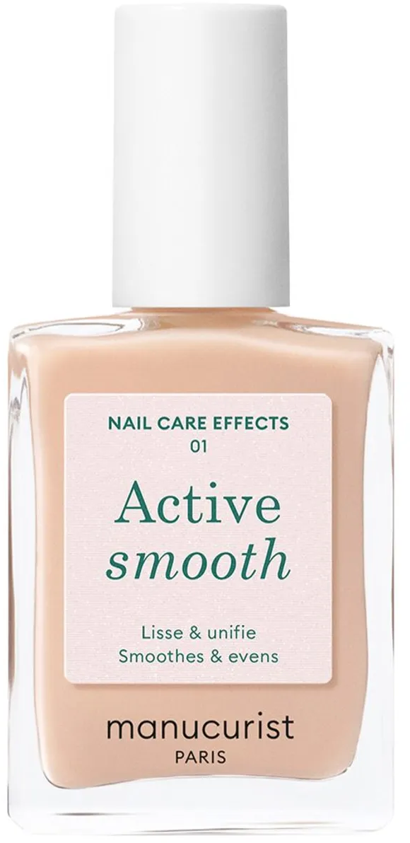 Active Smooth je bil razvit kot CC krema za nohte. Zahvaljujoč formuli, obogateni z ricinusovimi vlakni, takoj zgladi nepravilnosti, praske in proge na površini nohta. Še bolje? Gre za nevtralen odtenek, ki z enim samim potegom popravi barvo in poudari nohte. Vlakna ricinusovega olja: gladijo in popravljajo utore; Hexanal: utrjuje in globinsko obnavlja nohte; AHA (glikolna, mlečna in jabolčna kislina): popravljajo, ščitijo in vlažijo nohte; Vitamin E: upočasnjuje staranje in ščiti nohte.