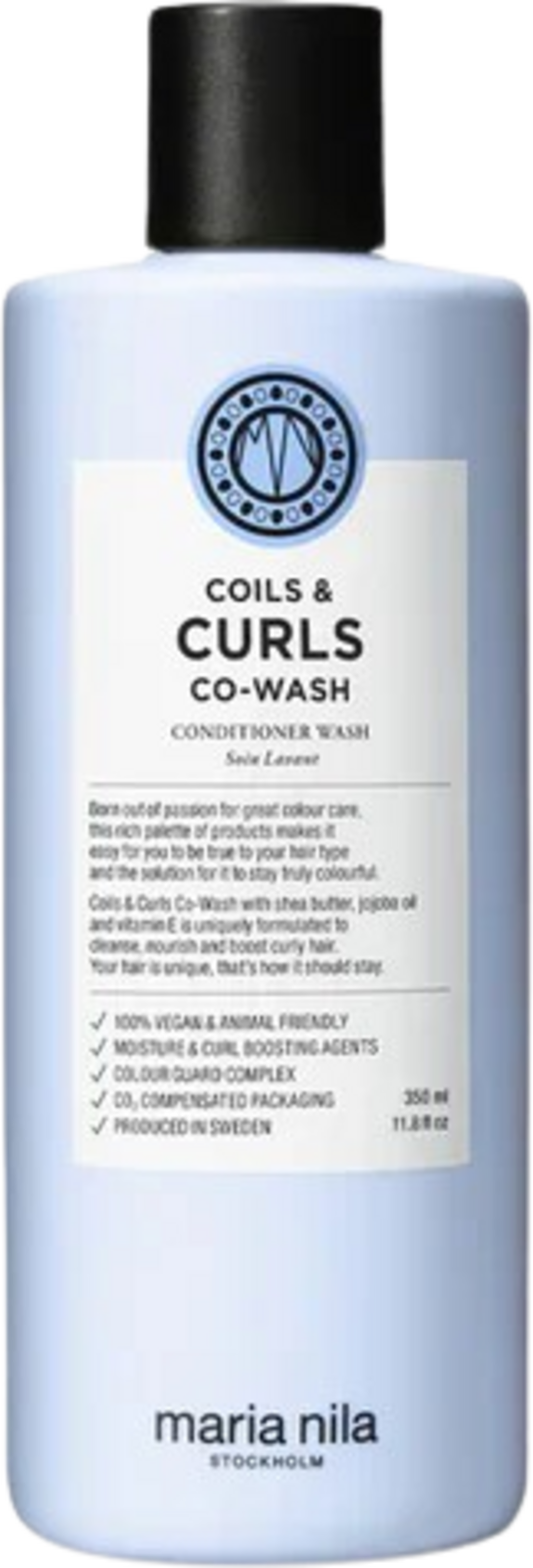 Coils & Curls Co-Wash znamke Maria Nila je čistilni, vlažilni in razvozljajoči balzam za naravno valovite, kodraste in skodrane lase. Formula z negovalno mešanico karitejevega masla, jojobinega olja, aloe vere in vitamina E poskrbi za nego las in lasišča ter ju pusti čista in mehka. Co-Wash preprečuje lomljenje las in jim podarja čudovit lesk. Zahvaljujoč lastniški zaščitni formuli ščiti barvo las ter zmanjšuje njen izpiranje zaradi umivanja, oblikovanja ali UV-žarkov. Svež in saden vonj z notami marelice in marakuje pa razvaja čute.