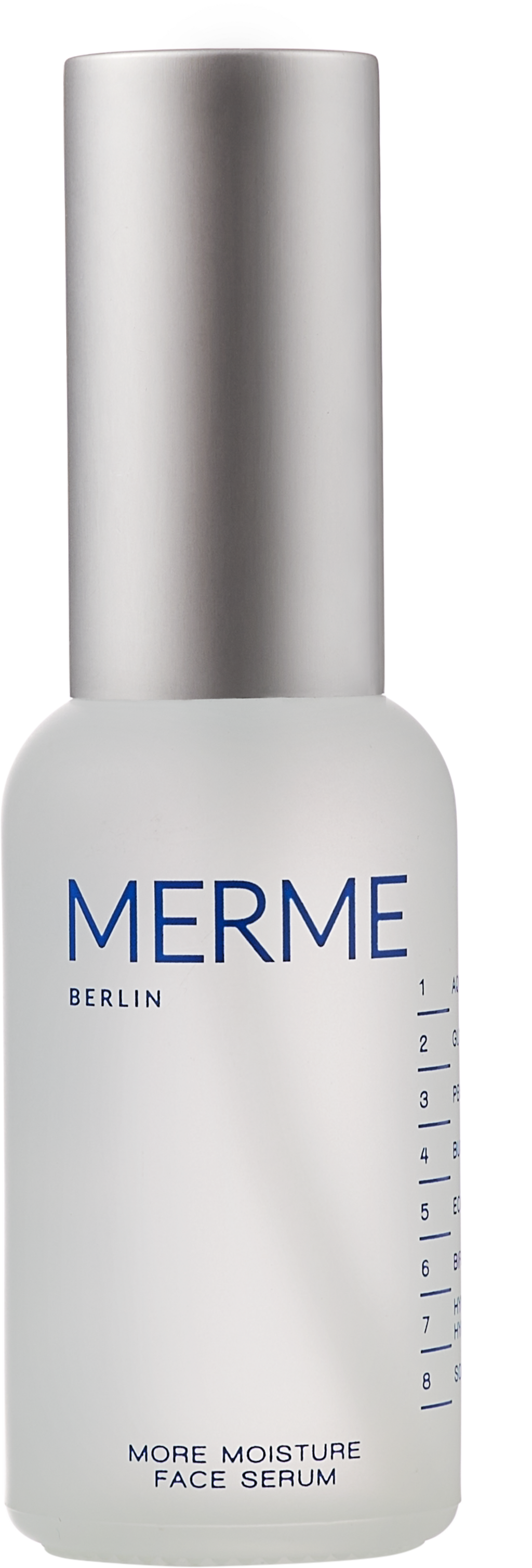 Serum za obraz More Moisture znamke MERME Berlin je formuliran s hialuronsko kislino sedmih molekularnih velikosti, ektoinom in bifida fermentiranim lizatom, ki zagotavljajo intenzivno hidratacijo kože, krepijo zaščitno pregrado in dolgotrajno prožnost. Serum se opira tudi na kombinacijo takojšnje in dolgotrajne vlage s ciljno usmerjeno uporabo hialuronske kisline z različnimi molekulskimi masami. Hialuronska kislina z nizko molekulsko maso prodre globoko v plasti kože in jo napolni od znotraj, medtem ko višje molekulske mase tvorijo zaščitno pregrado na površini in zmanjšujejo izgubo vlage. Ektoin (1 %), aktivna aminokislinska spojina, ščiti kožo pred okoljskimi stresorji, zmanjšuje občutljivost kože in gladi videz drobnih gubic. Serum ima tudi pomirjujoče lastnosti in se bori proti draženju. Bifida fermentirani lizat podpira kožni mikrobiom in izboljšuje elastičnost - za bolj gladko in bolj polno kožo.