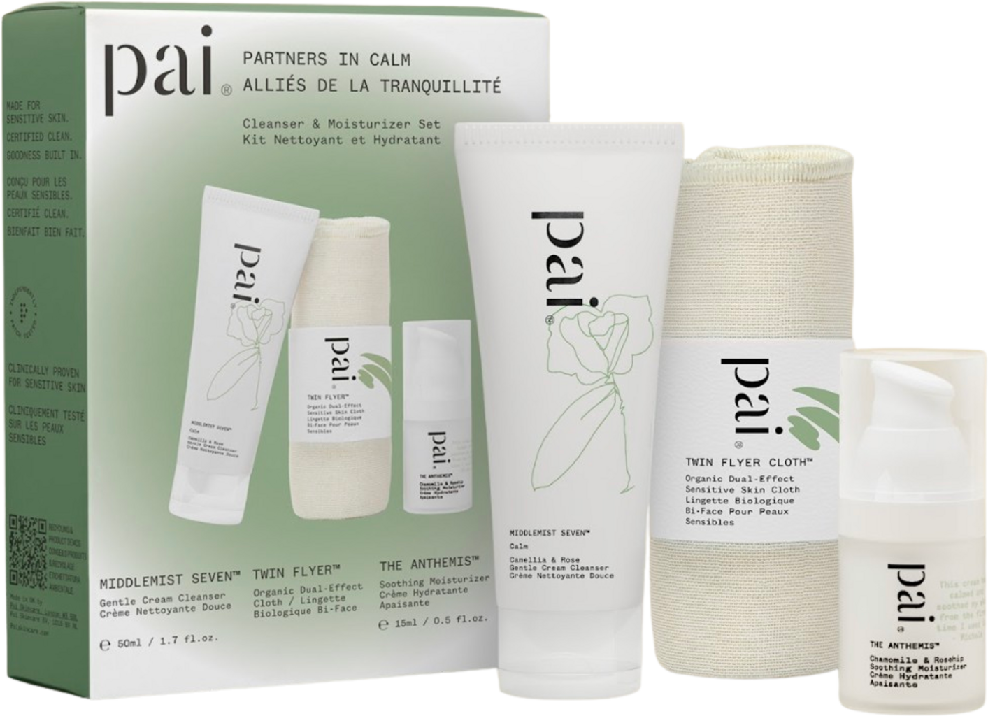 Visokokakovostni komplet Partners in Calm znamke Pai Skincare vsebuje dva izdelka za nego kože za vsakodnevno uporabo. Oba sta razvita za podporo in spoštovanje občutljive kože. Izjemno nežen Middlemist Seven Gentle Cream Cleanser dopolnjuje Twin Flyer Cloth, mehka čistilna krpica za nežno vsakodnevno čiščenje. Za optimalno nego po čiščenju poskrbi The Anthemis Soothing Moisturizer z močnimi sestavinami, kot sta kamilica in olje šipka, zagotavlja sijoč učinek za občutljivo kožo!