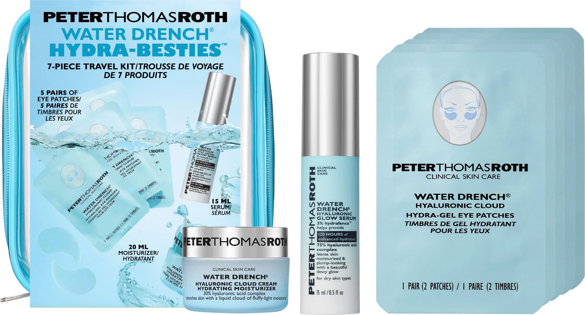 Hydra Besties 7-Piece Travel Kit znamke Peter Thomas Roth vsebuje priljubljene izdelke Water Drench®, ki vsi vsebujejo hialuronsko kislino in zagotavljajo optimalno hidratacijo. Izdelki so pakirani v vrečki z zadrgo za večkratno uporabo, ki jo lahko enostavno shranite v torbici ali ročni prtljagi.