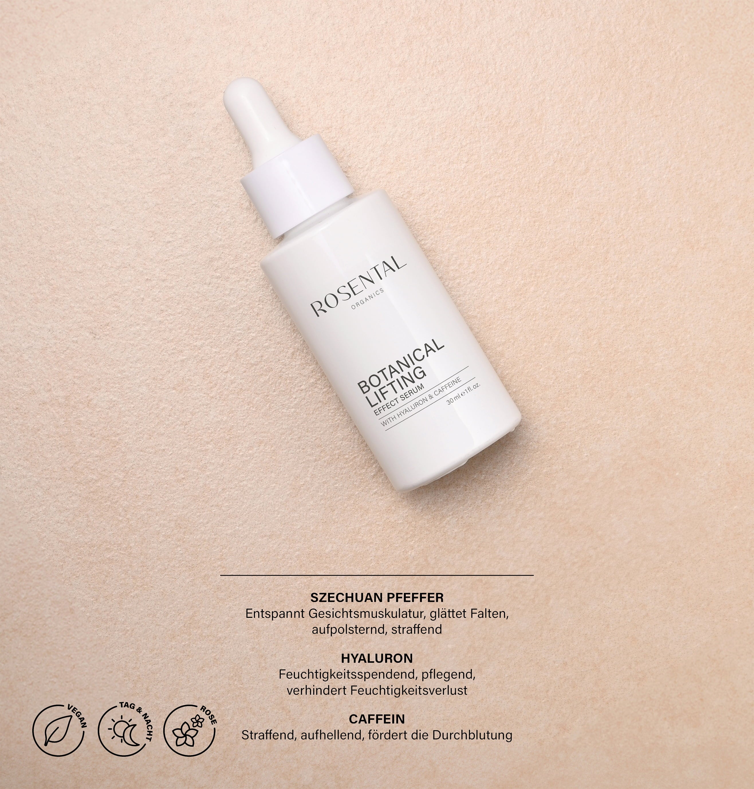 Serum Botanical Lifting Effect znamke Rosental Organics optimizira vsako rutino nege kože s svojimi visokokakovostnimi botaničnimi sestavinami. Mešanica hialuronske kisline in kofeina gladi drobne gubice, posvetli kožo in jo vlaži, medtem ko sečuanski poper sprošča obrazne mišice in koži daje čvrstejši videz.