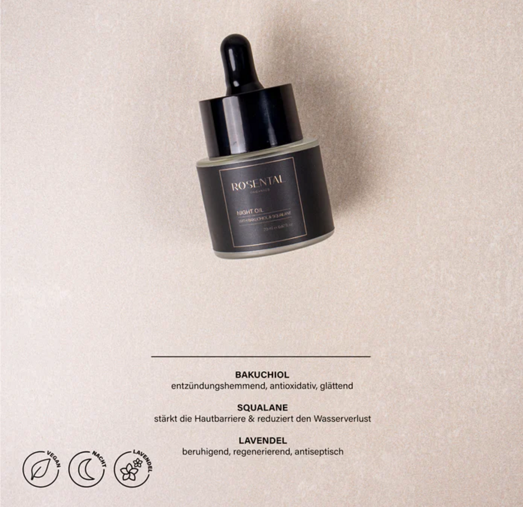 Night Oil znamke Rosental Organics je idealno za vašo večerno rutino nege obraza, saj spodbuja absorpcijo aktivnih sestavin iz vaših rutinskih izdelkov. Visokokakovostna kombinacija bakuchiola in skvalana naredi kožo svilnato gladko, ne da bi pustila mastne ostanke. Formula zagotavlja intenzivno vlaženje in hkrati preprečuje izgubo vode. Zahvaljujoč sivkinemu olju se ponoči odvija tudi proces regeneracije, tako da se zbudite poživljeni in revitalizirani. Spremlja vas balzamični, zeliščni vonj, ki pomaga umiriti vaš um.
