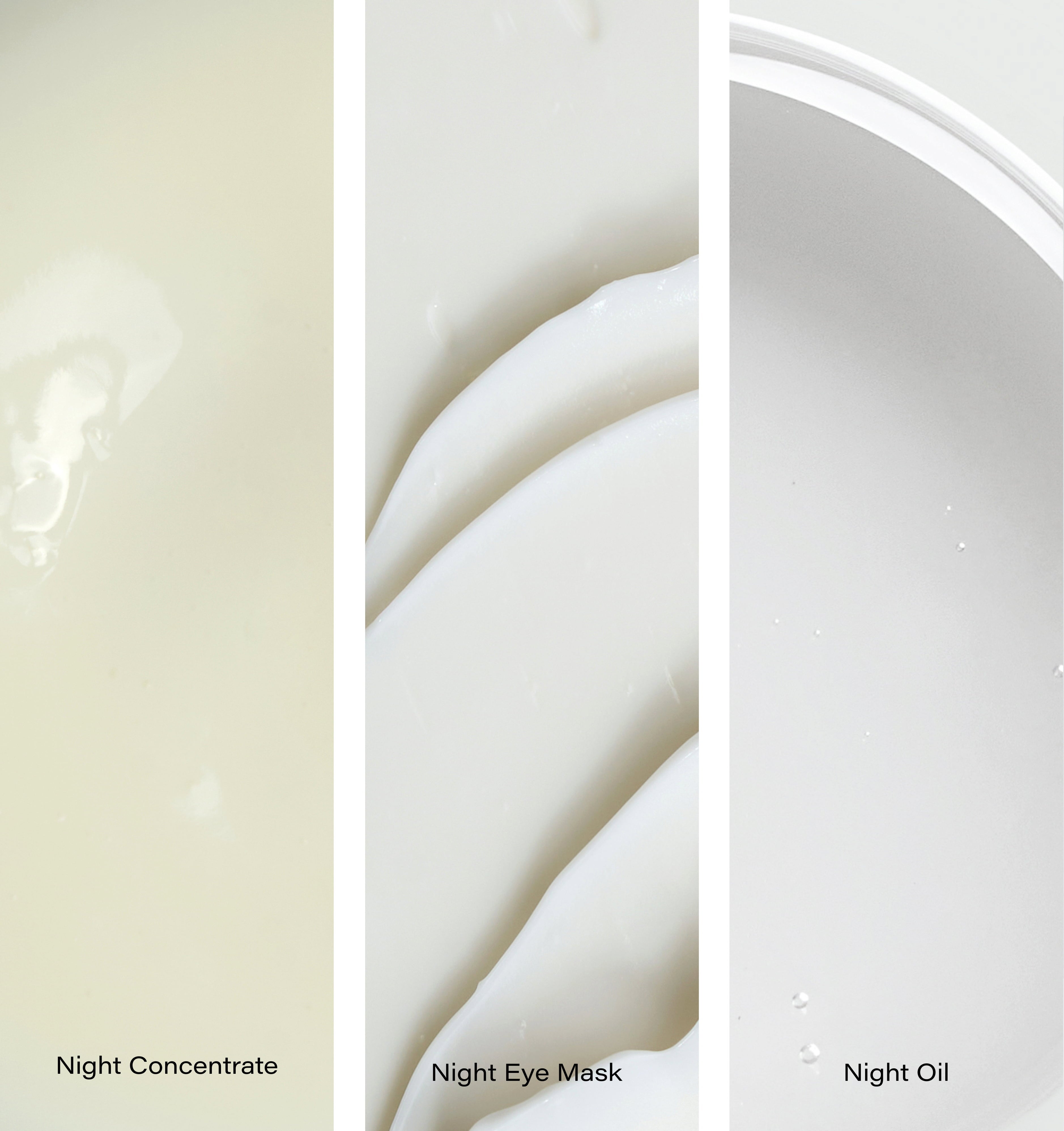 - Korak 3: Night Oil z bakuchiolom, skvalanom in sivko: intenzivno neguje, gladi linije suhosti in zapira vlago brez mastnega občutka.