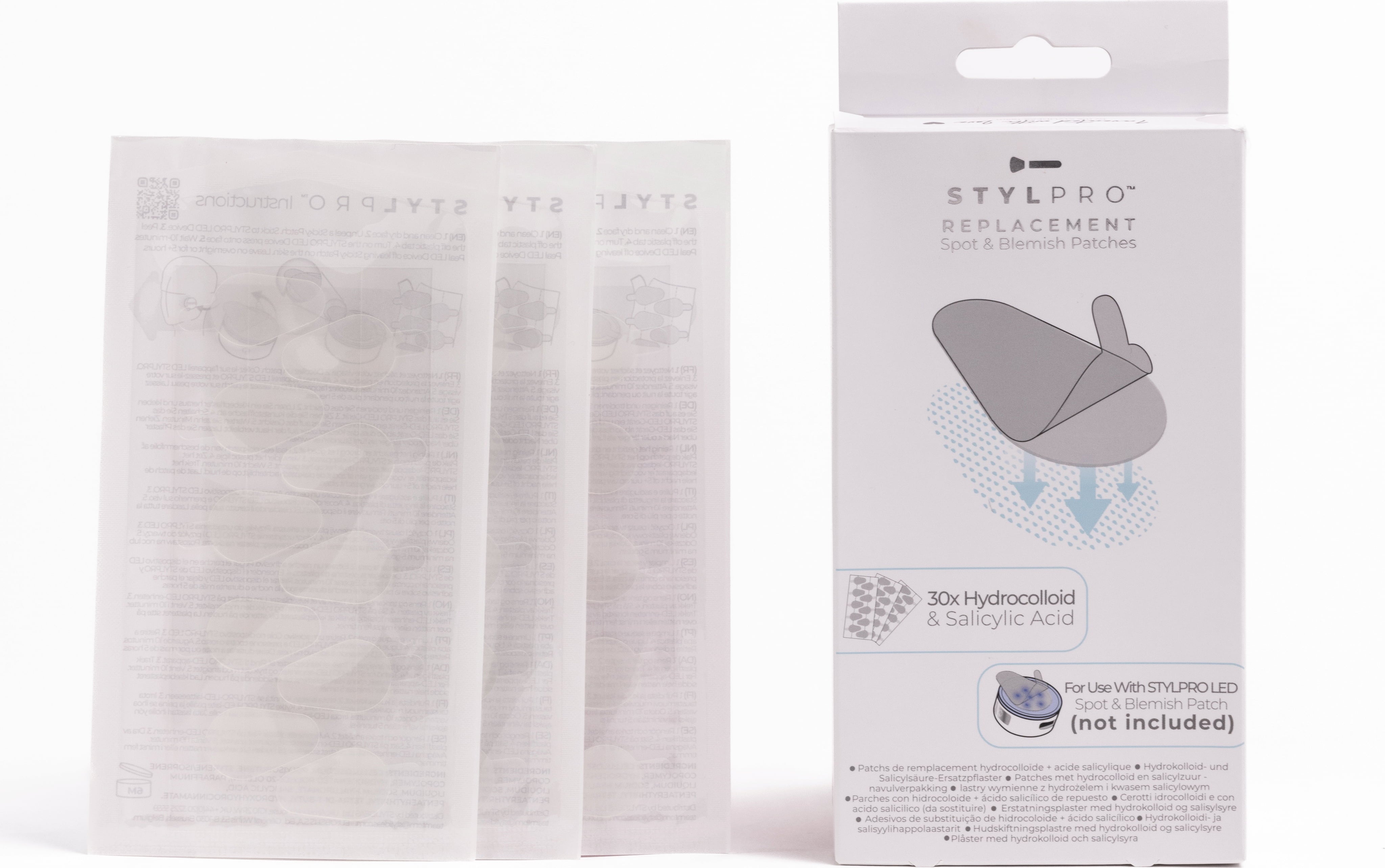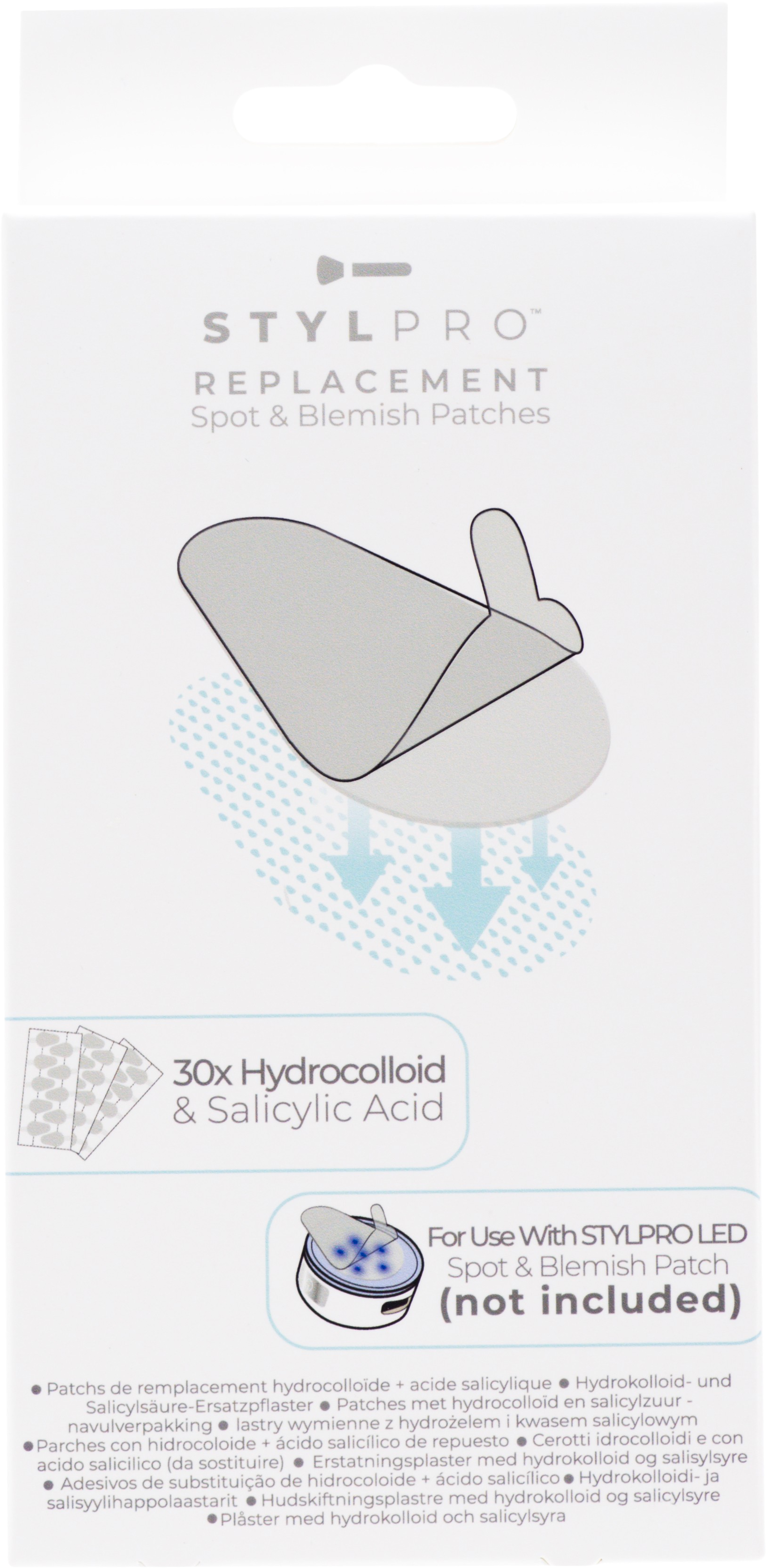 Hydrocolloid & Salicylic Acid Replacement Patches znamke StylPro so samolepilni obliži, ki jih je mogoče ponovno napolniti in vstaviti v StylPro LED Spot & Blemish Patch. Pomagajo absorbirati nečistoče ali umazanijo ter nežno pilingirati kožo.