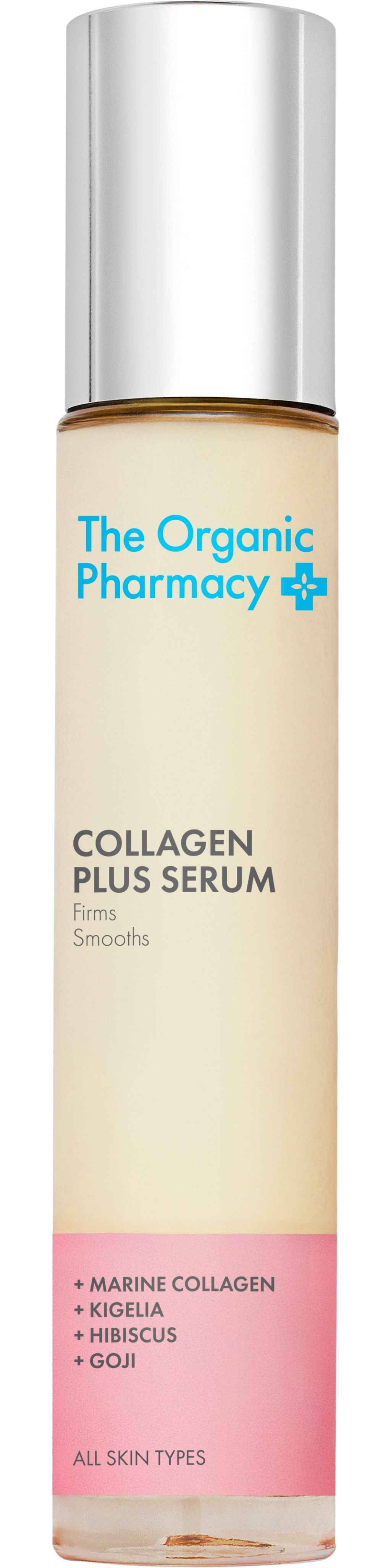 Collagen Plus Serum znamke Organic Pharmacy je koncentrirana nega obraza, ki cilja na drobne gubice, linije in izgubo čvrstosti. Formula vsebuje morski kolagen, bogat z aminokislinami, za učvrstitev ter antioksidativno kigelio in hibiskus za spodbujanje kolagena in elastičnosti. Ta kombinacija, okrepljena z zaščitnimi goji jagodami, pričara svež, sijoč in dvignjen videz.