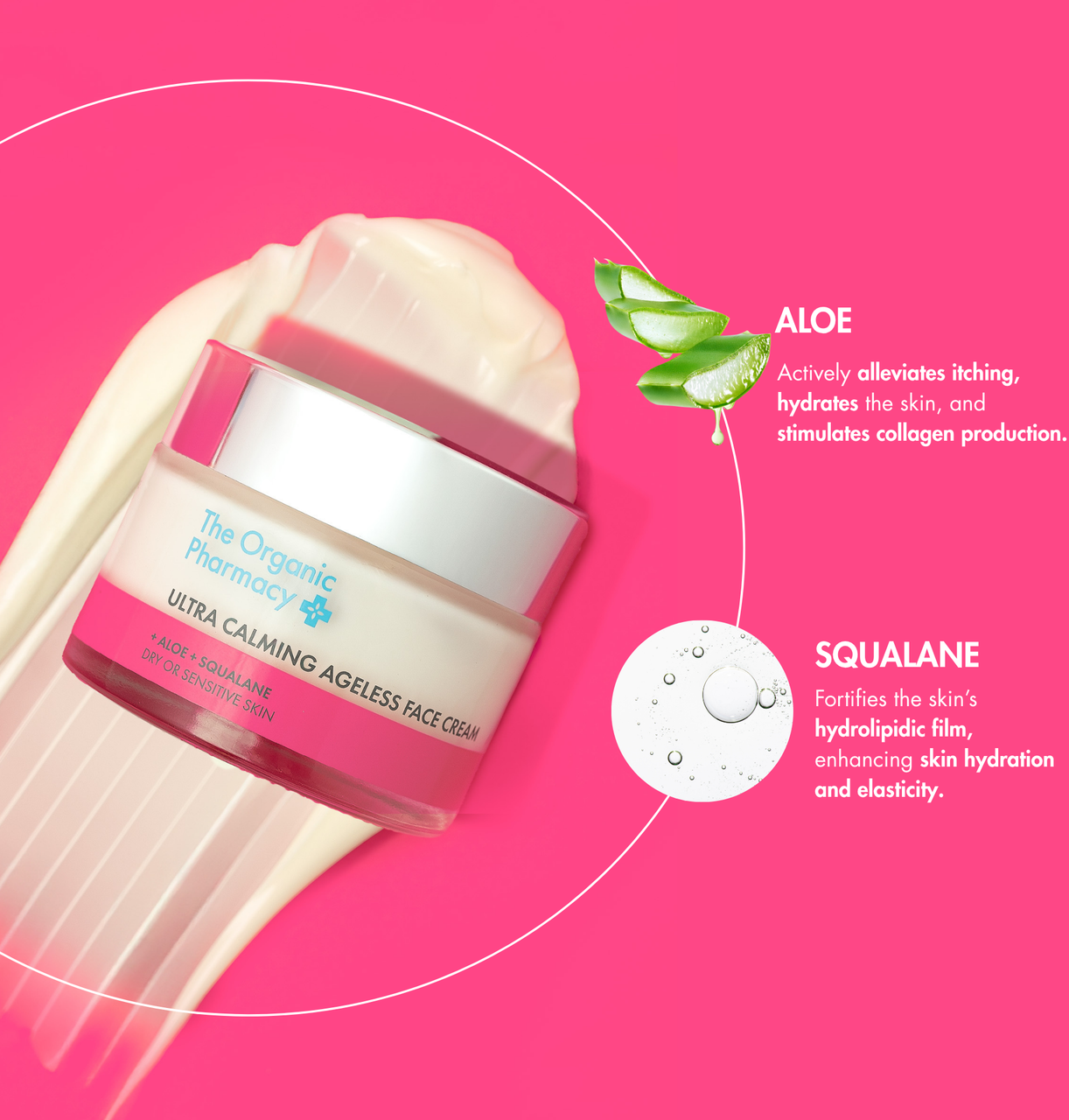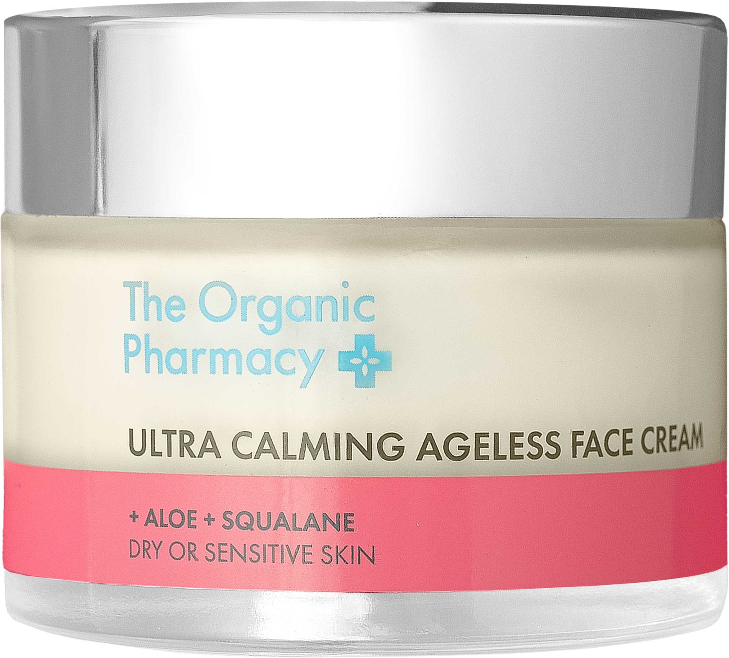 Ultra Calming Ageless Face Cream znamke Organic Pharmacy spodbuja sijaj kože in je bila posebej razvita za občutljivo kožo. Formula izkorišča pomirjujoče lastnosti aloe vere, da zagotovi intenzivno vlaženje tudi suhi ali obremenjeni koži. Krema, obogatena s skvalanom, krepi hidrolipidni film kože, izboljšuje njeno vlažilno pregrado in elastičnost. Krema podpira tudi absorpcijo hranil, hkrati pa ščiti pred poškodbami prostih radikalov. To omogoča koži hitro regeneracijo in izboljša njeno celotno strukturo.
