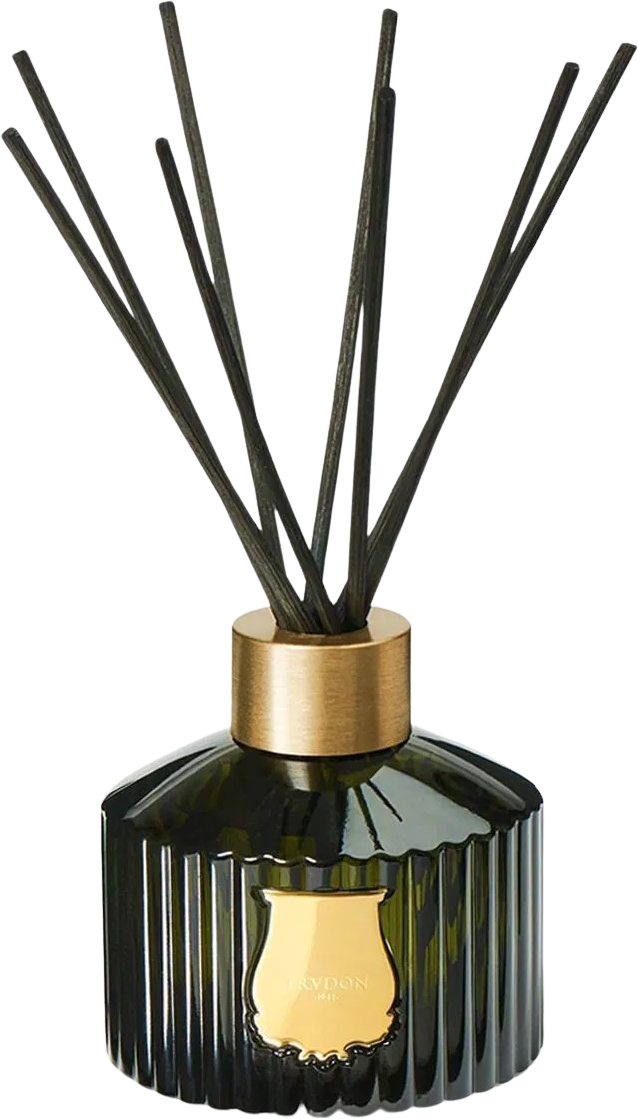 Difuzor Gabriel znamke Trudon je izdelan iz ikoničnega zelenega stekla in okrašen z zlatim emblemom. Difuzor je ročno izdelan v tovarni Trudon v Franciji in je okronan z aluminijastim obročem. Skozi ta obroč je vstavljenih osem črnih, naravnih ratanovih palčk, ki enakomerno razpršijo dišavo po prostoru.