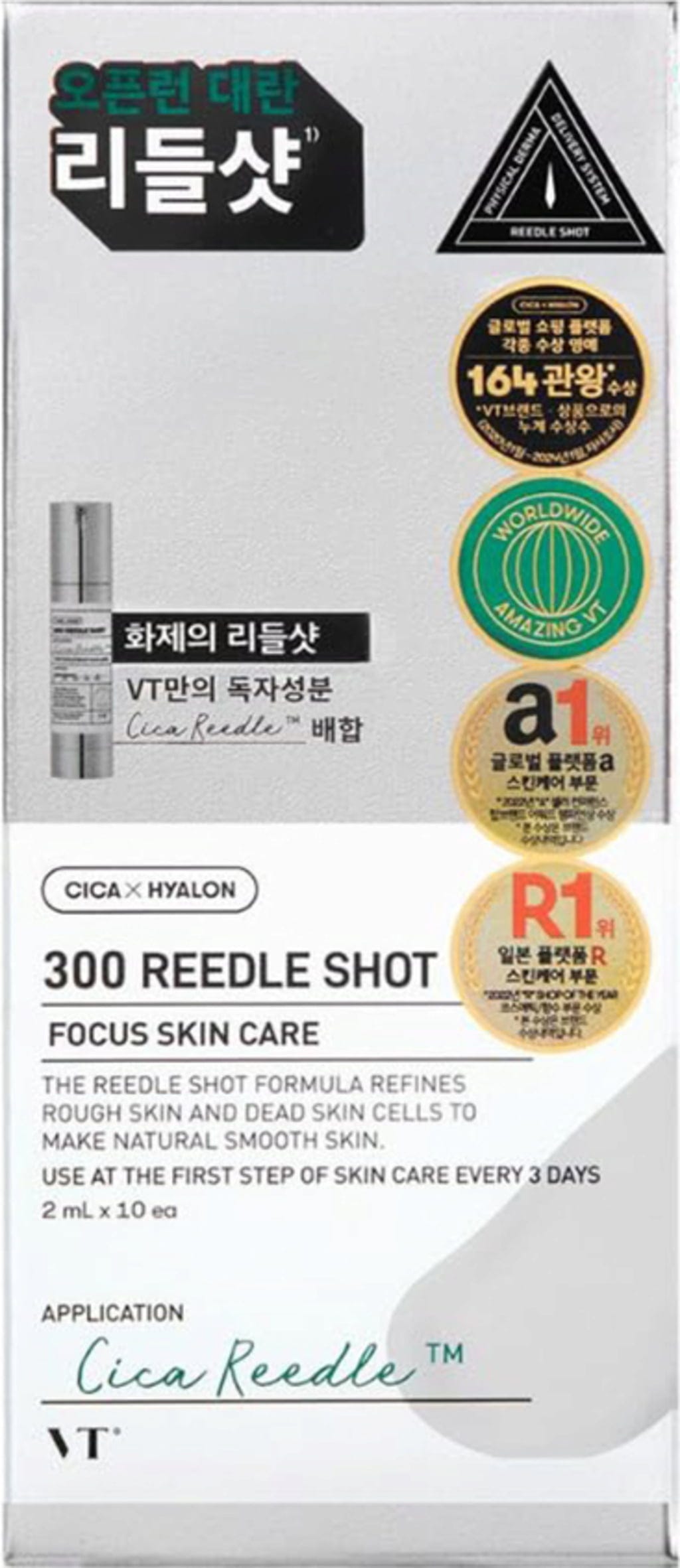 Reedle Shot 300 znamke VT Cosmetics prodre globoko v kožo in s patentiranim kompleksom Cica Reedle™ (amonijak + hialuronska kislina z nizko molekulsko maso) simulira delovanje mikroiglic. Formulo dodatno izboljšuje Cica Hyalon™, kombinacija izvlečka Centelle Asiatica, trojne hialuronske kisline in izvlečka zelenega propolisa. Te sestavine spodbujajo želeni učinek steklene kože in aktivirajo naravni proces obnove kože z nežnim sproščanjem nakopičenih nečistoč. To zgladi in izboljša teksturo kože ter vidno posvetli temne madeže, ki jih povzročajo pigmentacija ali brazgotine po aknah. Reedle Shot 300 koži omogoča tudi, da učinkoviteje in hitreje absorbira hranila in aktivne sestavine iz drugih izdelkov za nego kože. Ta tretma je primeren za vse tipe kože, vključno z občutljivo kožo.